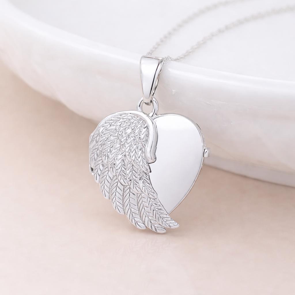 A heart-shaped solid sterling silver embossed angel wing keepsake locket with space for a personal message on the back and two photos inside.