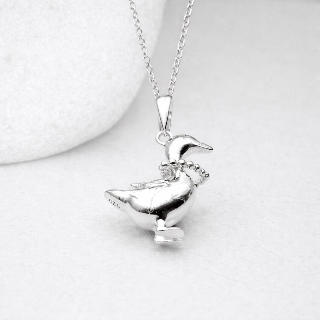 This Mother Goose pendant necklace is crafted from solid 925 sterling silver and finished in a bright polished silver tone. Designed as a charming goose silhouette with a delicate beaded ring and moving heart charm around its neck, it combines playful character with heartfelt symbolism.