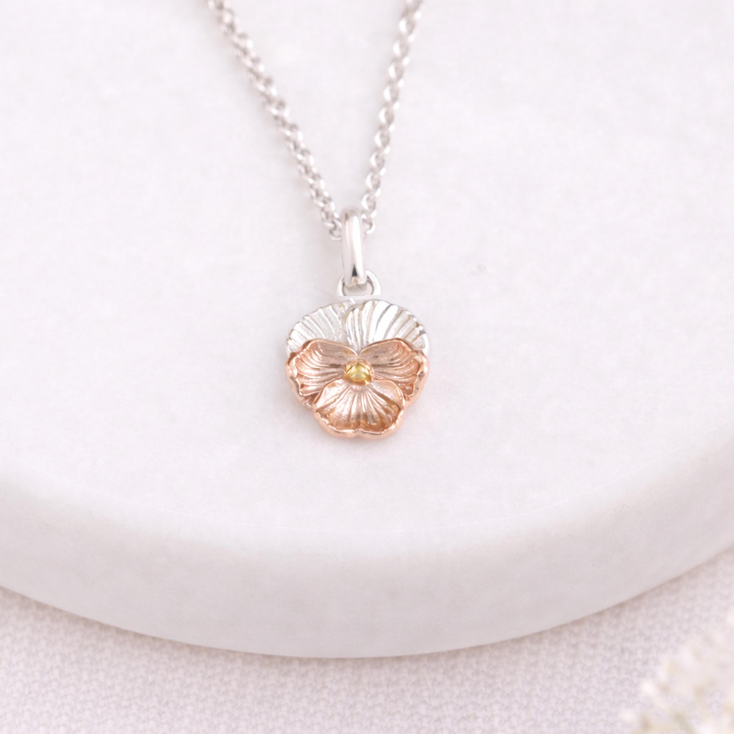 This violet flower pendant is crafted from solid 925 sterling silver and finished with a beautiful combination of 18ct yellow and rose gold plating, creating a soft, romantic design inspired by nature.