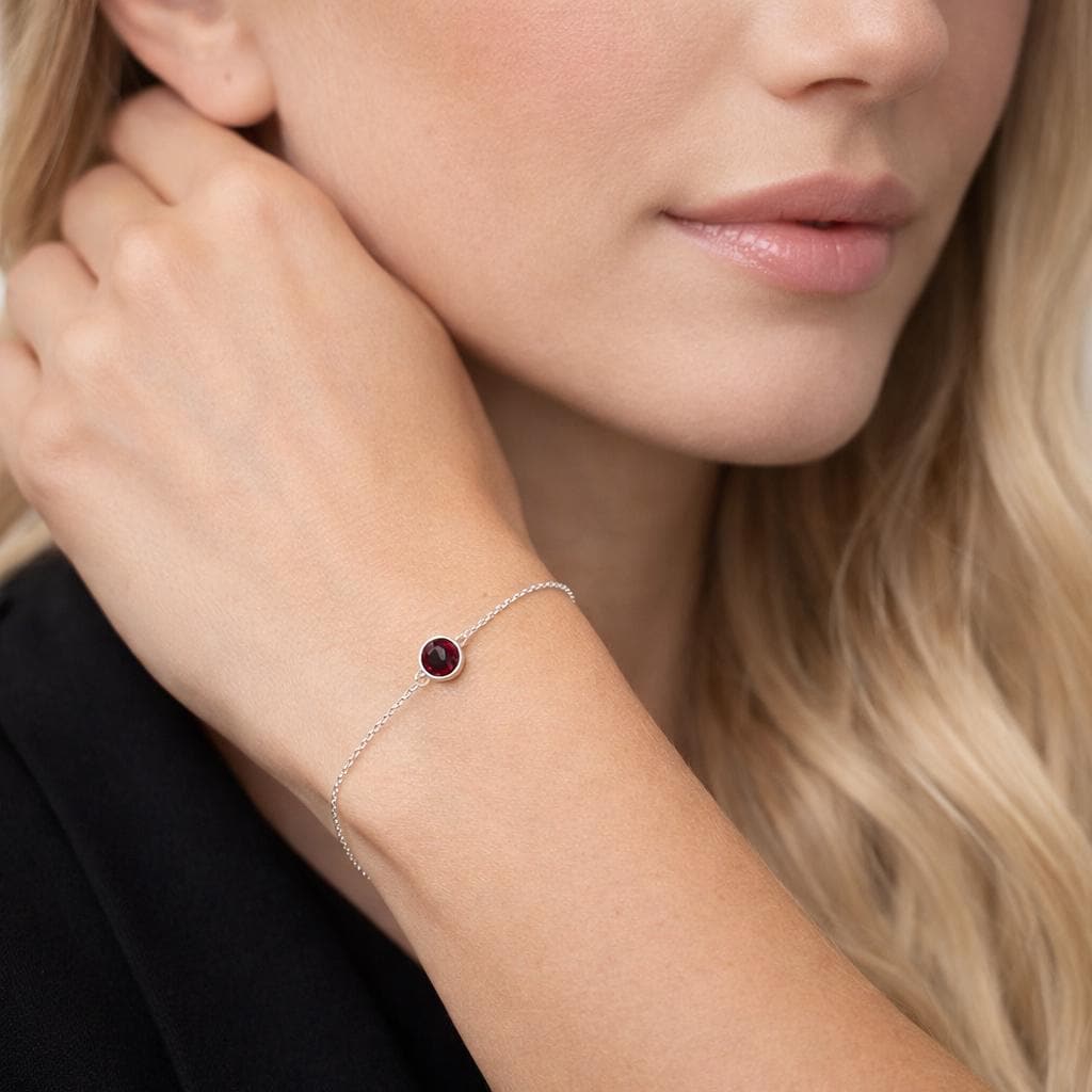 Carefully crafted from sterling silver, this bracelet is designed with a minimalist silhouette that allows the deep red garnet-coloured cubic zirconia to take centre stage. The stone is bezel set for a clean, modern finish and sits neatly at the centre of the wrist, making it perfect for everyday wear or special occasions.