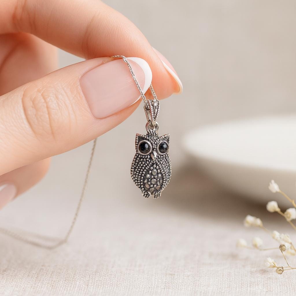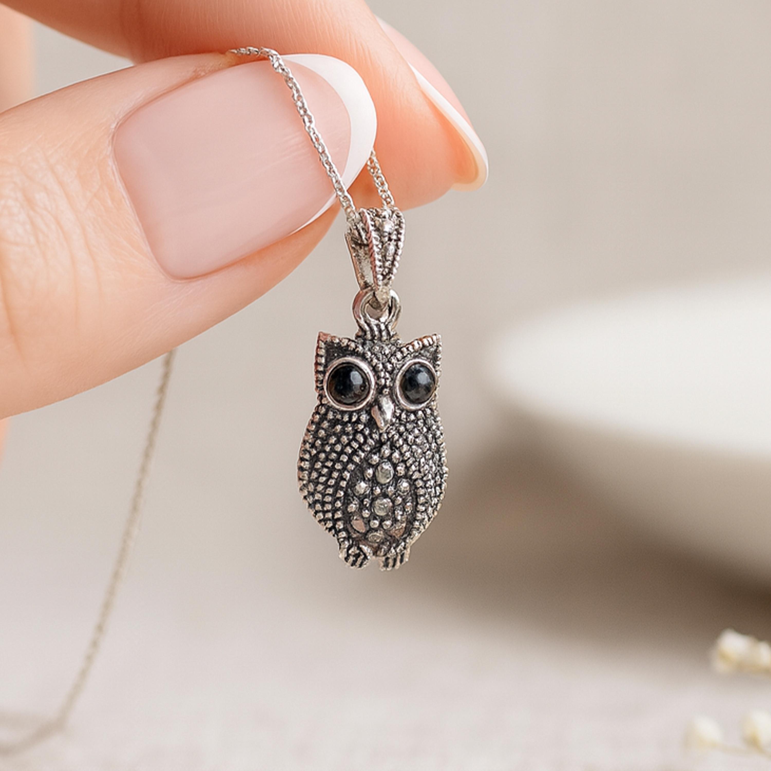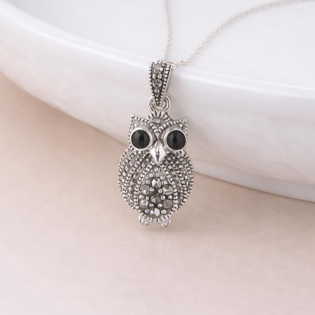 A vintage-inspired silver owl pendant with marcasite – personalise with a name or date to create a meaningful gift full of wisdom, intuition and charm.