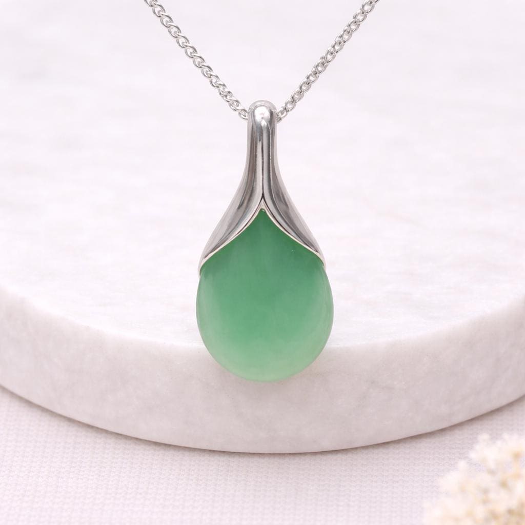 Jade has long been associated with harmony, balance, and protection, making this pendant a meaningful choice as well as a beautifully wearable one. The polished silver cap flows seamlessly into the soft teardrop shape, allowing the natural green tones of the jade to take centre stage. With its satisfying weight and clean lines, this necklace feels both luxurious and grounding.