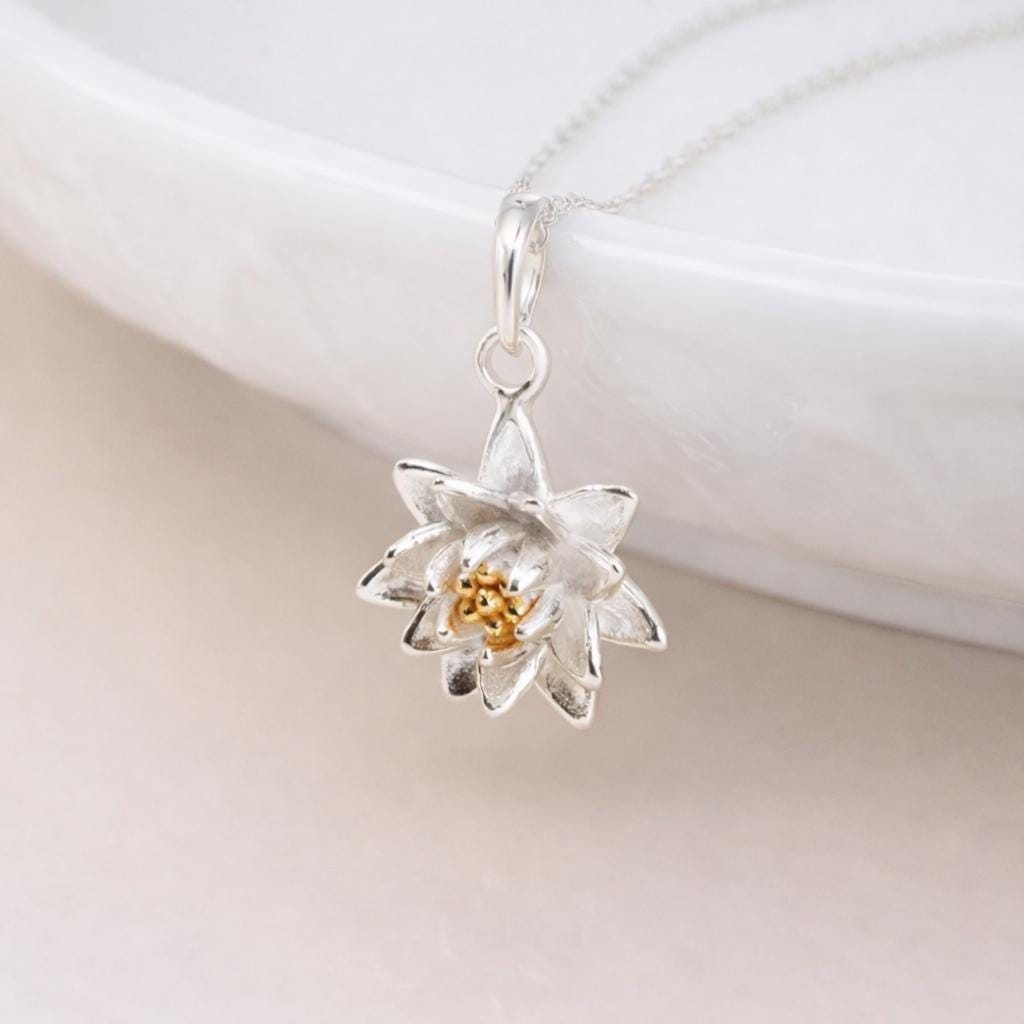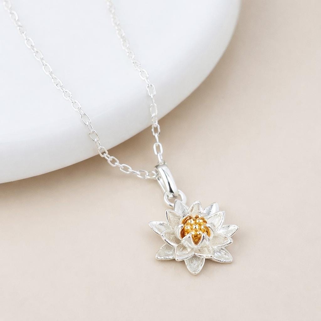 This Water Lily pendant is crafted from solid 925 sterling silver and finished with delicate 18ct yellow gold plated detailing, creating a beautifully layered floral design inspired by the calm elegance of the water lily.