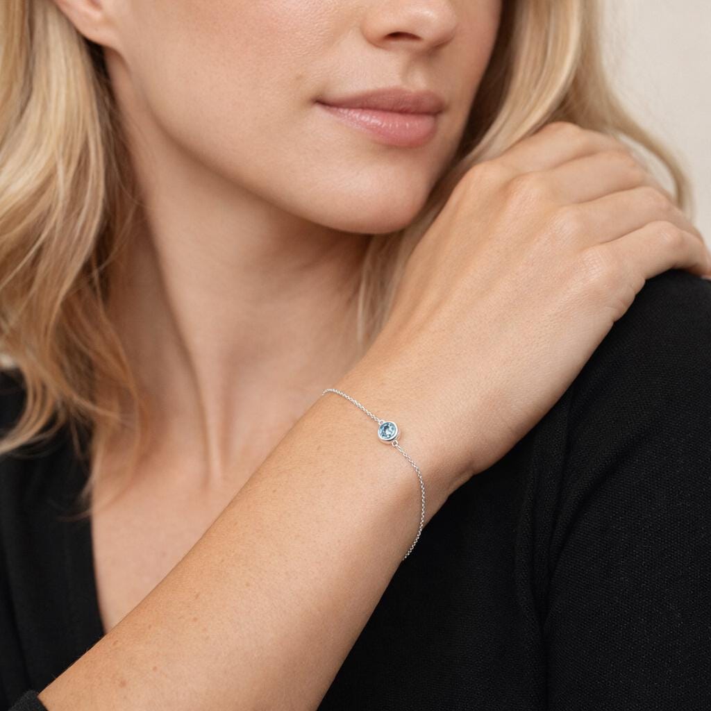 The soft blue cubic zirconia mirrors the fresh, tranquil tones of aquamarine. Shades can range from pale icy blue to brighter sea blue hues depending on the light. As a faceted stone, it reflects light beautifully, offering a crisp sparkle while maintaining an elegant, understated look. Aquamarine is traditionally associated with calm, clarity, and protection, making this bracelet a meaningful gift for March birthdays.