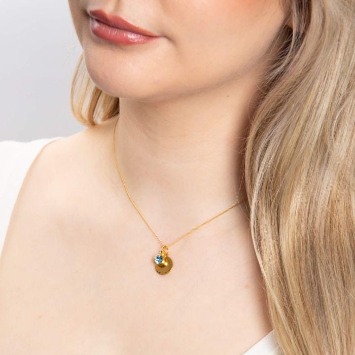 This personalised aqua blue birthstone charm necklace is made from solid 925 sterling silver with 18ct yellow gold plating and finished in a warm gold tone, featuring a sparkling aqua blue cubic zirconia charm with the option to add an engraved disc for a meaningful, layered keepsake.