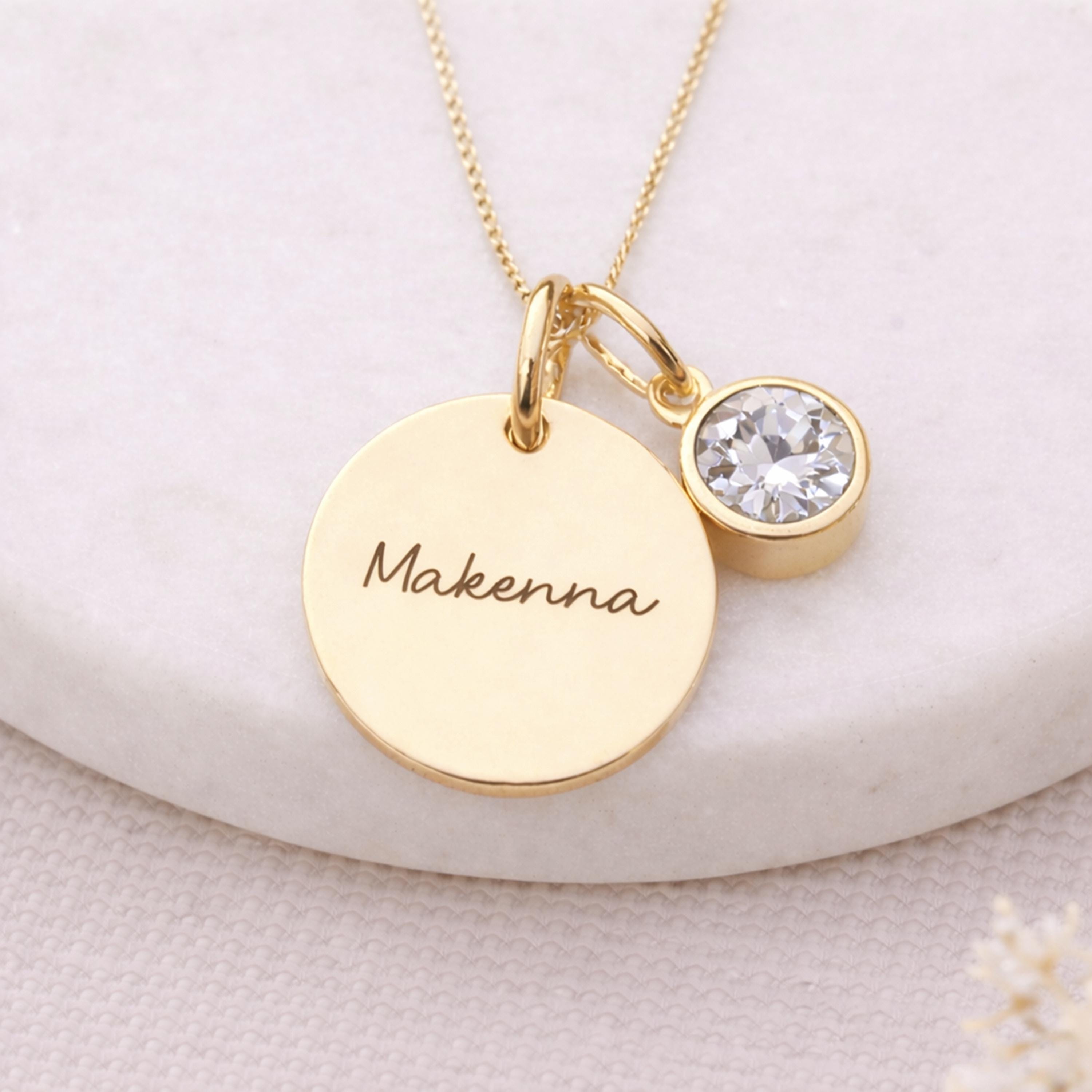 This personalised diamond-coloured birthstone charm necklace is made from solid 925 sterling silver with 18ct yellow gold plating, featuring a clear cubic zirconia charm with the option to add an engraved disc for a meaningful, layered keepsake.