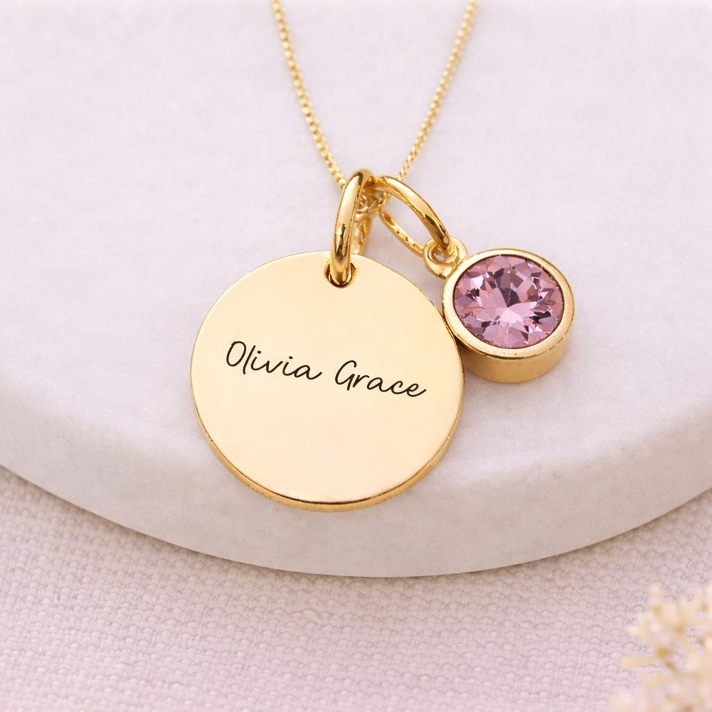 The charm is designed to sit neatly on a chain, offering gentle sparkle without overpowering the look. Alongside the birthstone charm, a separate 15mm gold plated disc can be added and engraved with a name, initials, date, or short message, allowing you to create a truly personal necklace that celebrates a special moment.