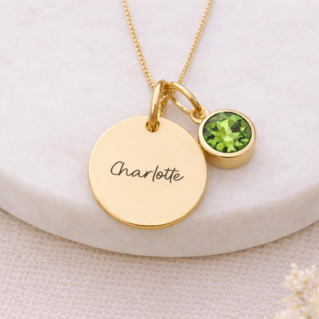 This personalised peridot coloured birthstone charm necklace is made from solid 925 sterling silver with 18ct yellow gold plating, featuring a fresh green cubic zirconia charm with the option to add an engraved disc for a meaningful, layered keepsake.