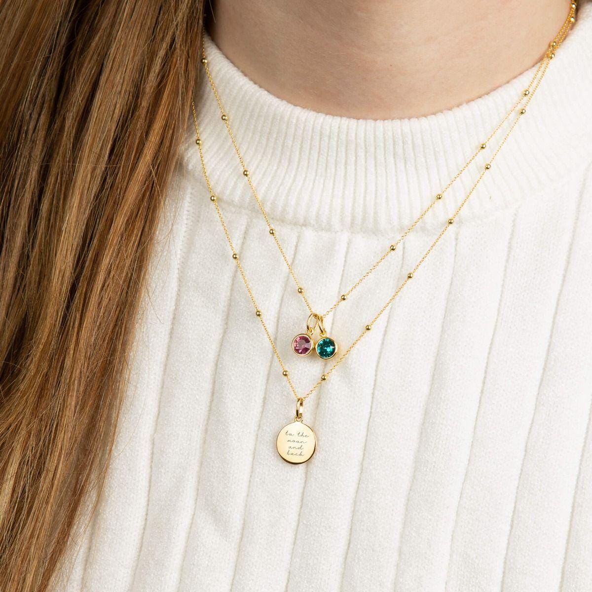 The charm is designed to sit neatly on the chain, offering a beautiful pop of colour without overpowering the look. Alongside the birthstone charm, a separate 15mm gold-plated disc can be added and engraved with a name, initials, date, or short message, allowing you to create a truly personal necklace that marks a special moment.