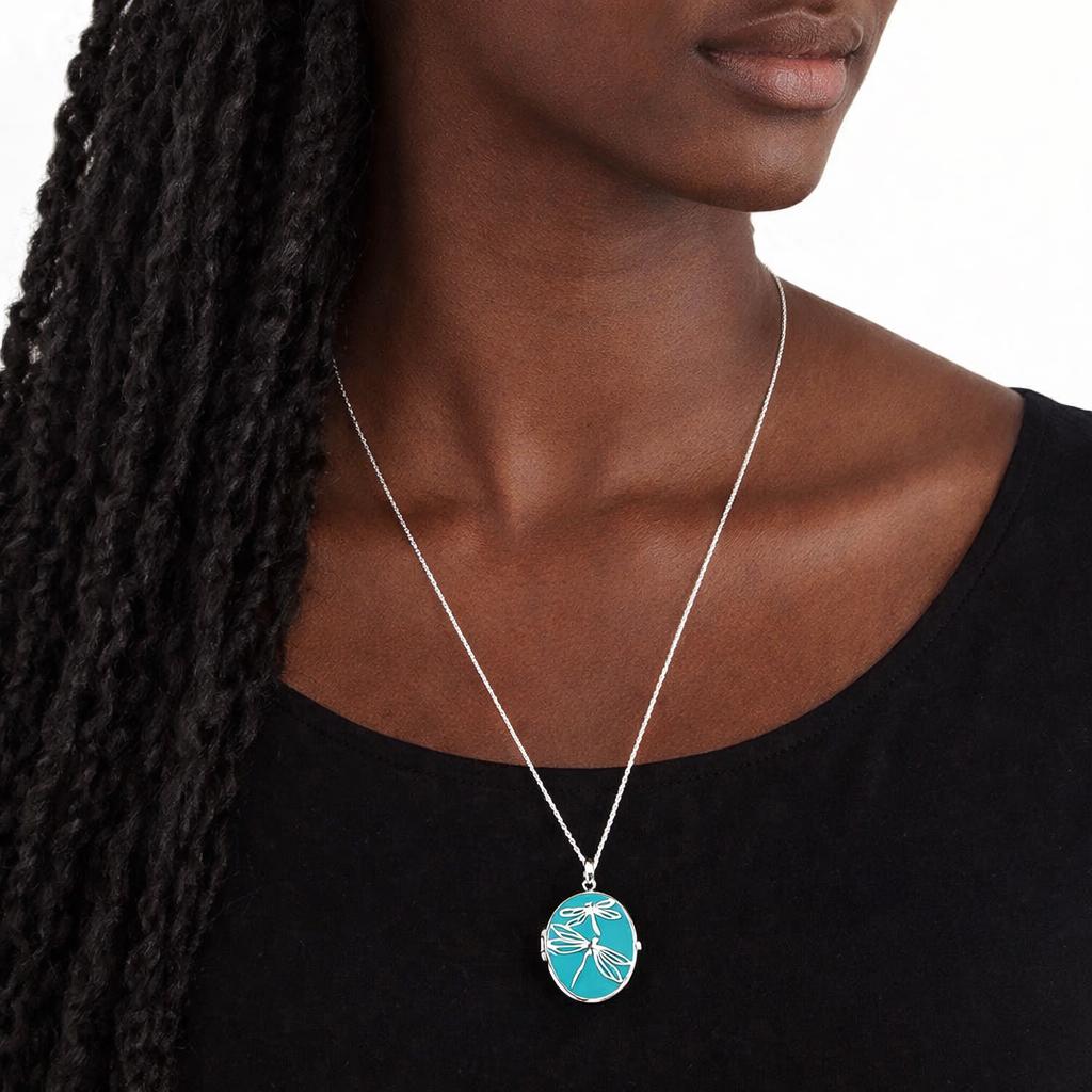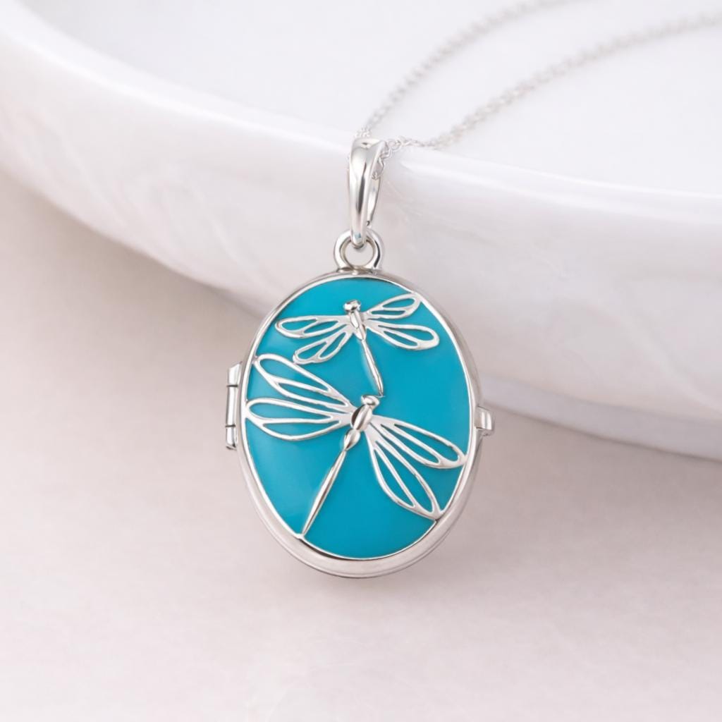 This beautifully handcrafted sterling silver locket features a mother and child dragonfly design set against a dreamy blue enamel background — each one carefully hand-finished to make it truly one of a kind.