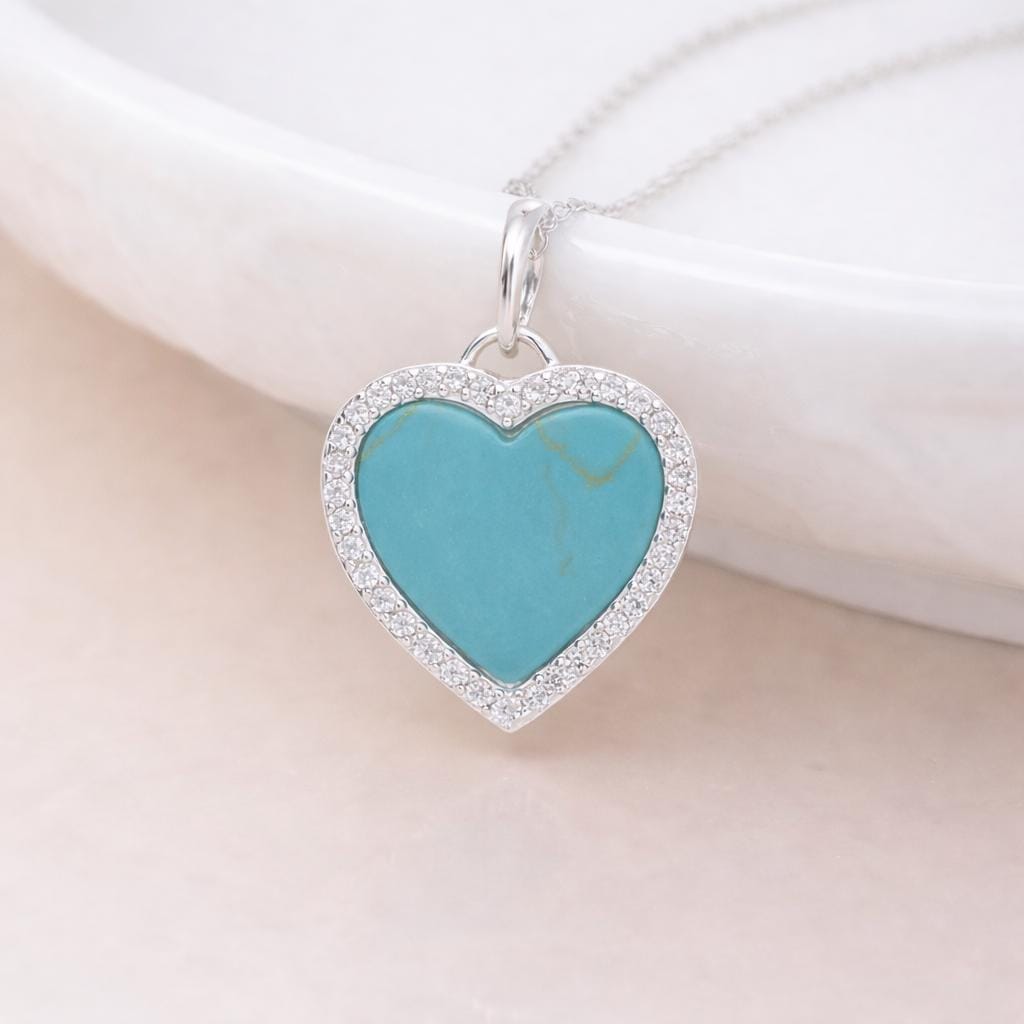 A bright turquoise heart pendant with a sparkling CZ halo and engraved disc – a feel-good, meaningful gift for birthdays or self-love moments.