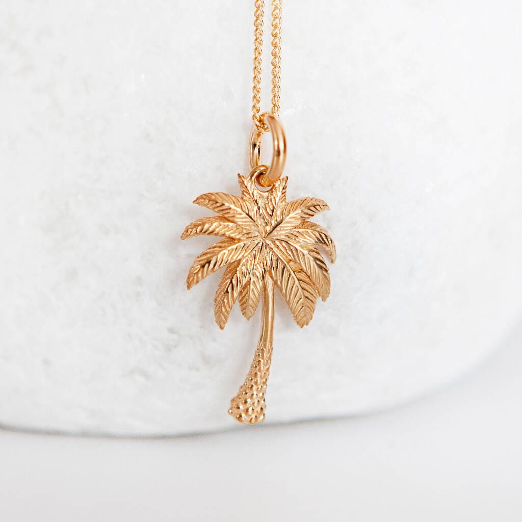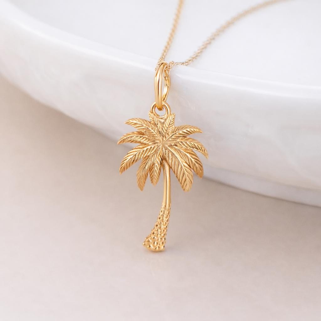 A detailed golden palm tree pendant – personalise with a name, date or message for a sunny keepsake full of holiday memories and good vibes.