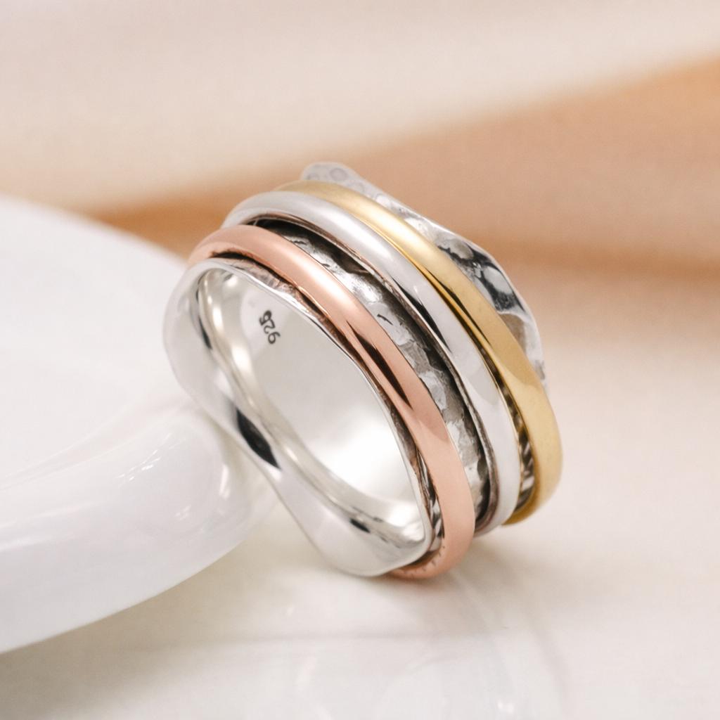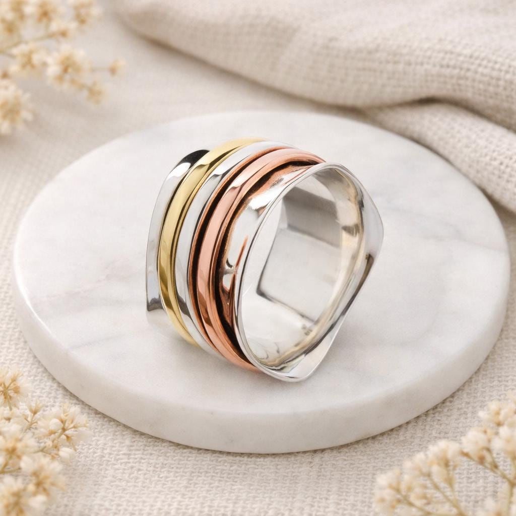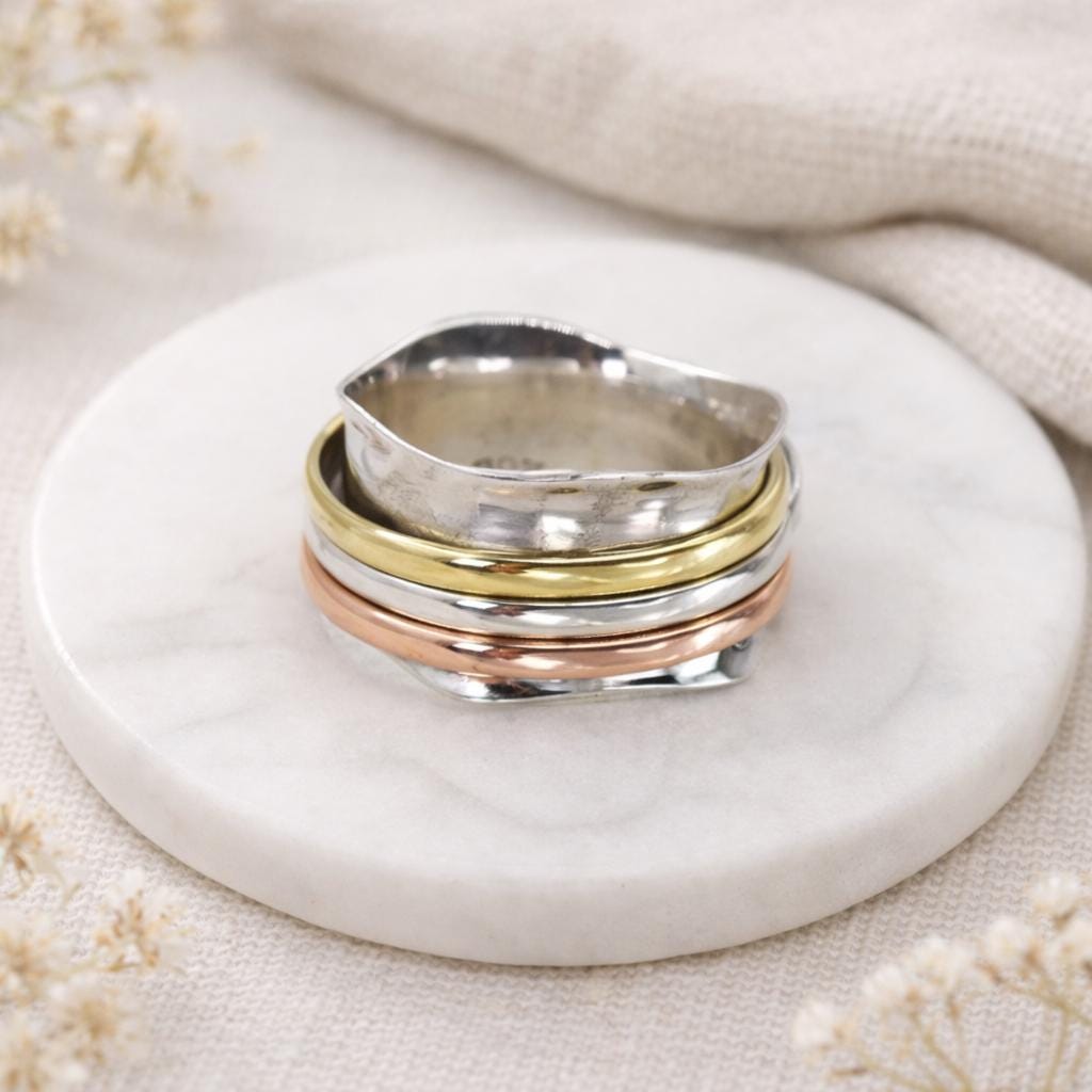 Made by hand using solid 925 sterling silver, the main band features a gently flowing wave shaped edge that feels organic and comfortable on the finger. Three smooth spinner bands sit neatly within the design and rotate freely, one in sterling silver, one in warm copper, and one in golden brass. The combination of metals adds depth and contrast, while the movement offers a calming, grounding feel many people love in a spinner ring.
