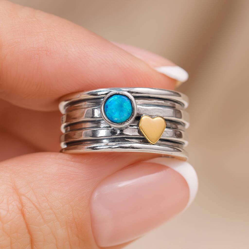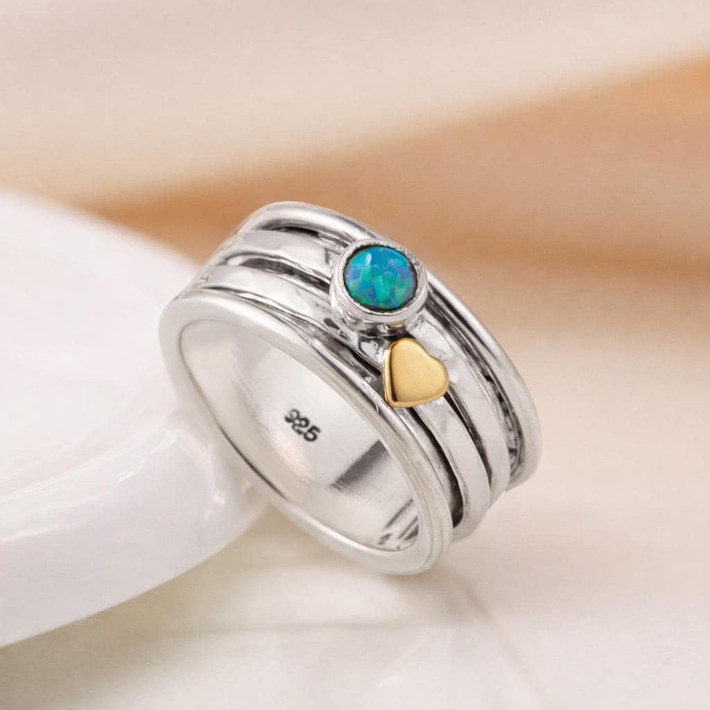 Made by hand from solid 925 sterling silver, this ring is built with a generous 10mm wide main band for comfort and presence. Slim silver spinner bands rotate freely around the ring, offering a calming, tactile element, while a 4mm Bello opal is set into the design to add flashes of blue and green. A small golden brass heart sits alongside the opal, bringing warmth and a subtle symbol of love and connection.