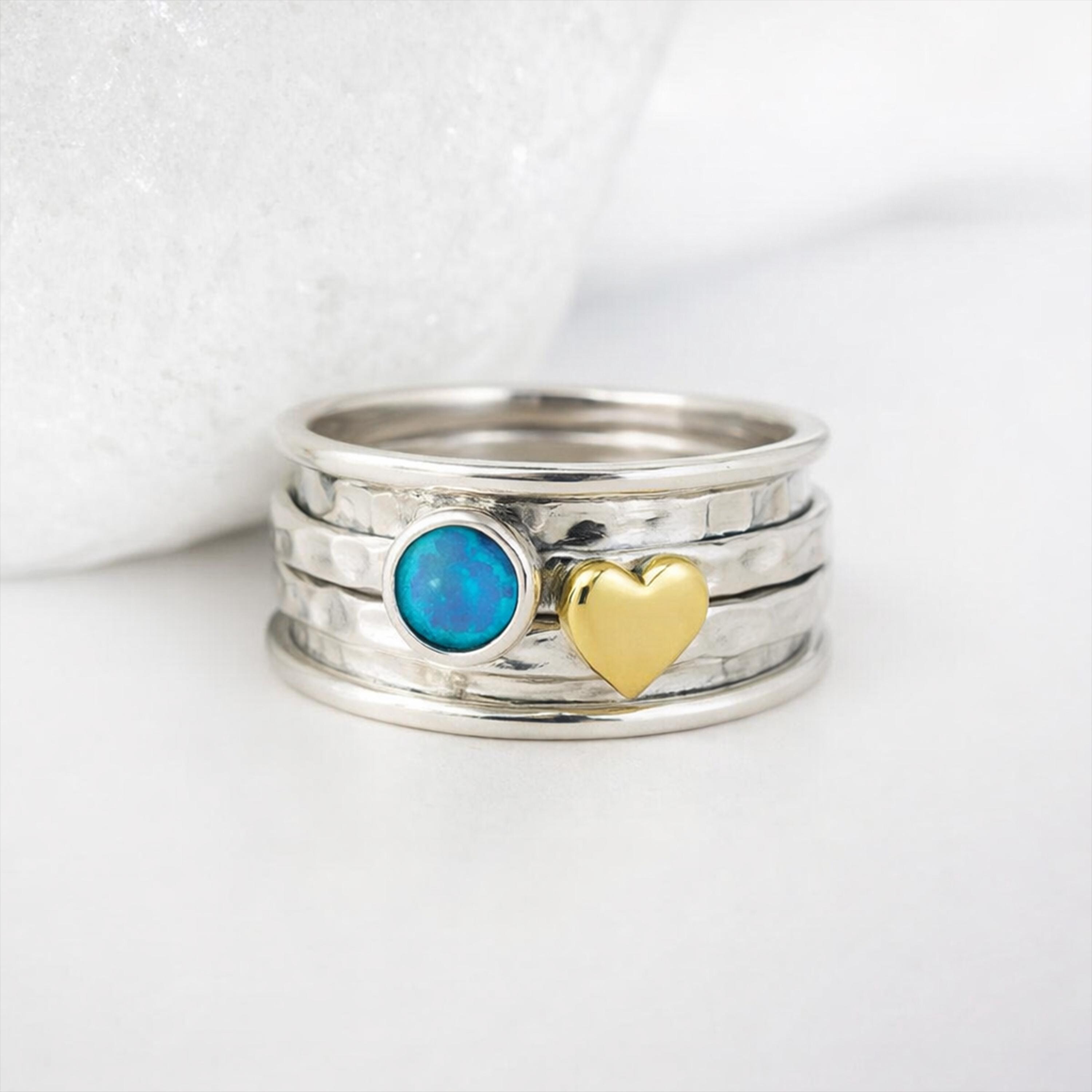 This handcrafted sterling silver and brass spinner ring features a wide silver band with rotating silver spinners, a vivid blue Bello opal, and a small golden heart detail, creating a meaningful statement ring designed for everyday wear.
