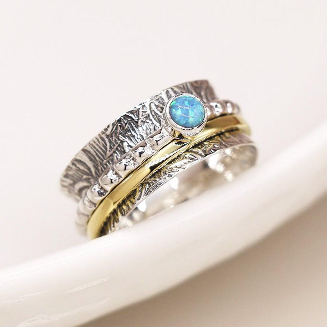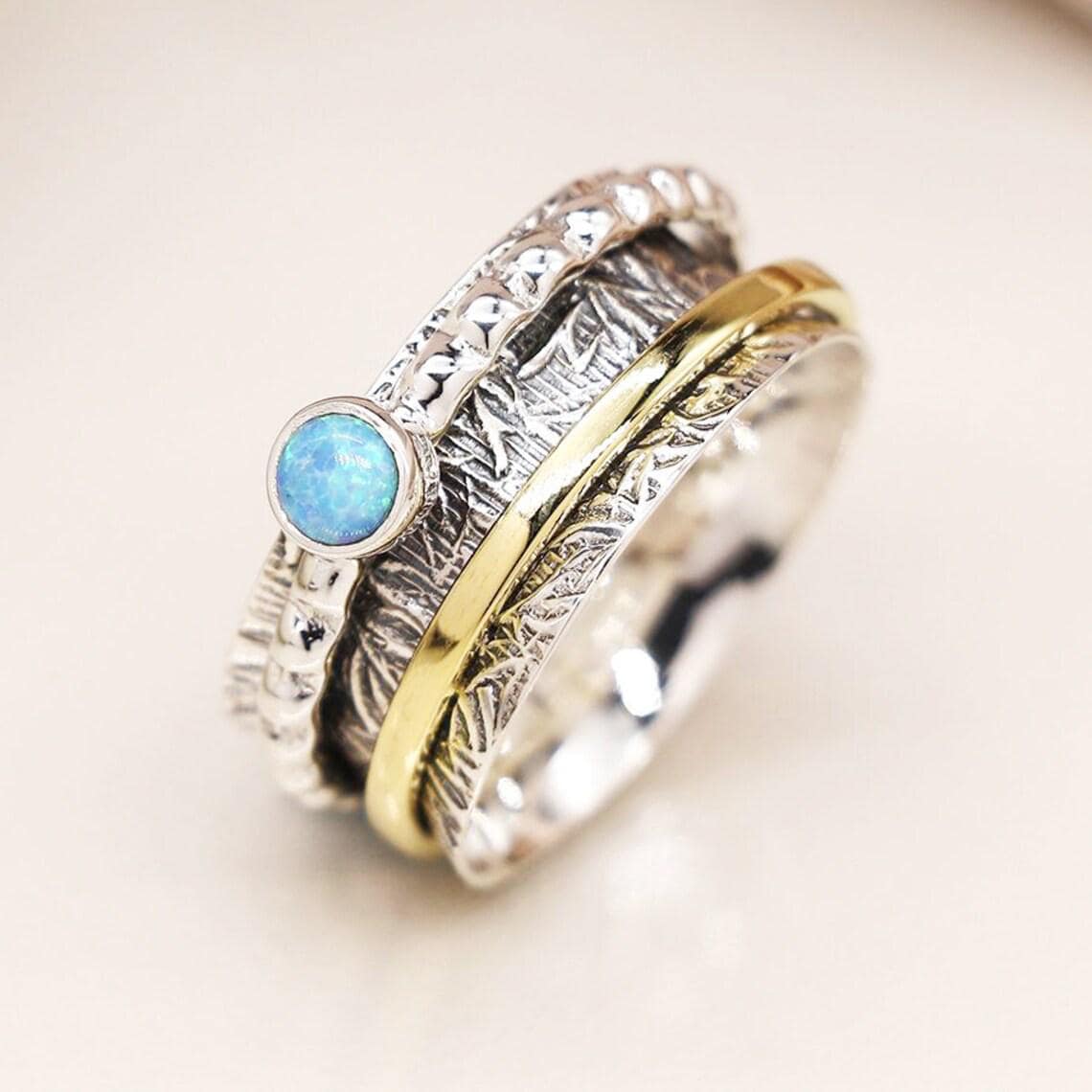 Made by hand using solid 925 sterling silver, this wide ring is built up from multiple textured layers, each carefully shaped and finished to create depth and visual interest. A polished golden brass spinner band and a dotted silver spinner band rotate freely, adding both tactile comfort and eye catching contrast. Set into the design is a 4mm blue Bello Opal, glowing with flashes of ocean blue and green.