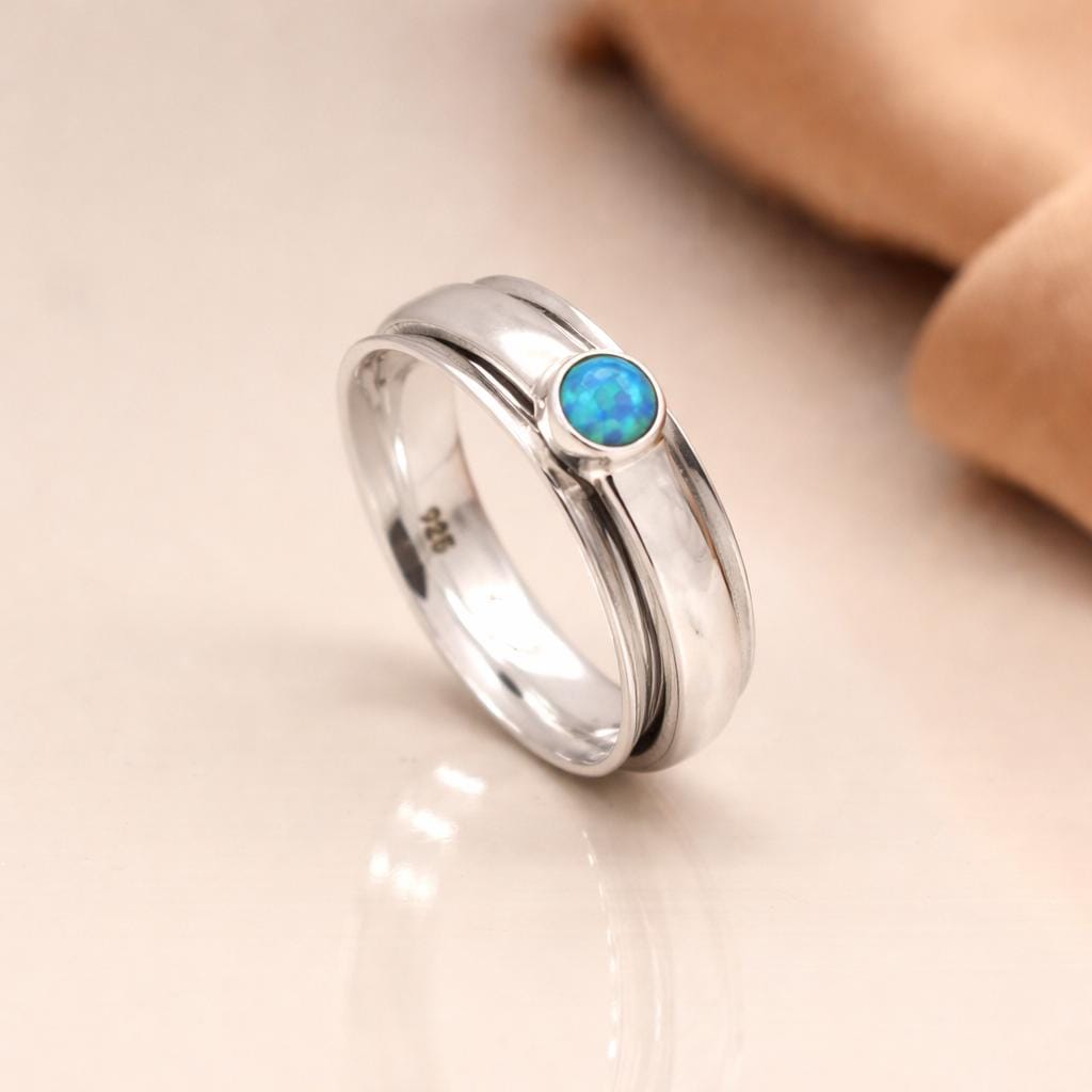 Made by hand from solid 925 sterling silver, this ring is designed with a smooth 5mm main band for comfort and a wider 4mm spinning band that rotates freely around the finger. A 3mm blue Bello opal is set into the spinner, catching the light with flashes of blue and green that add subtle character without feeling bold. Each ring is individually crafted and finished, meaning no two are ever exactly the same.