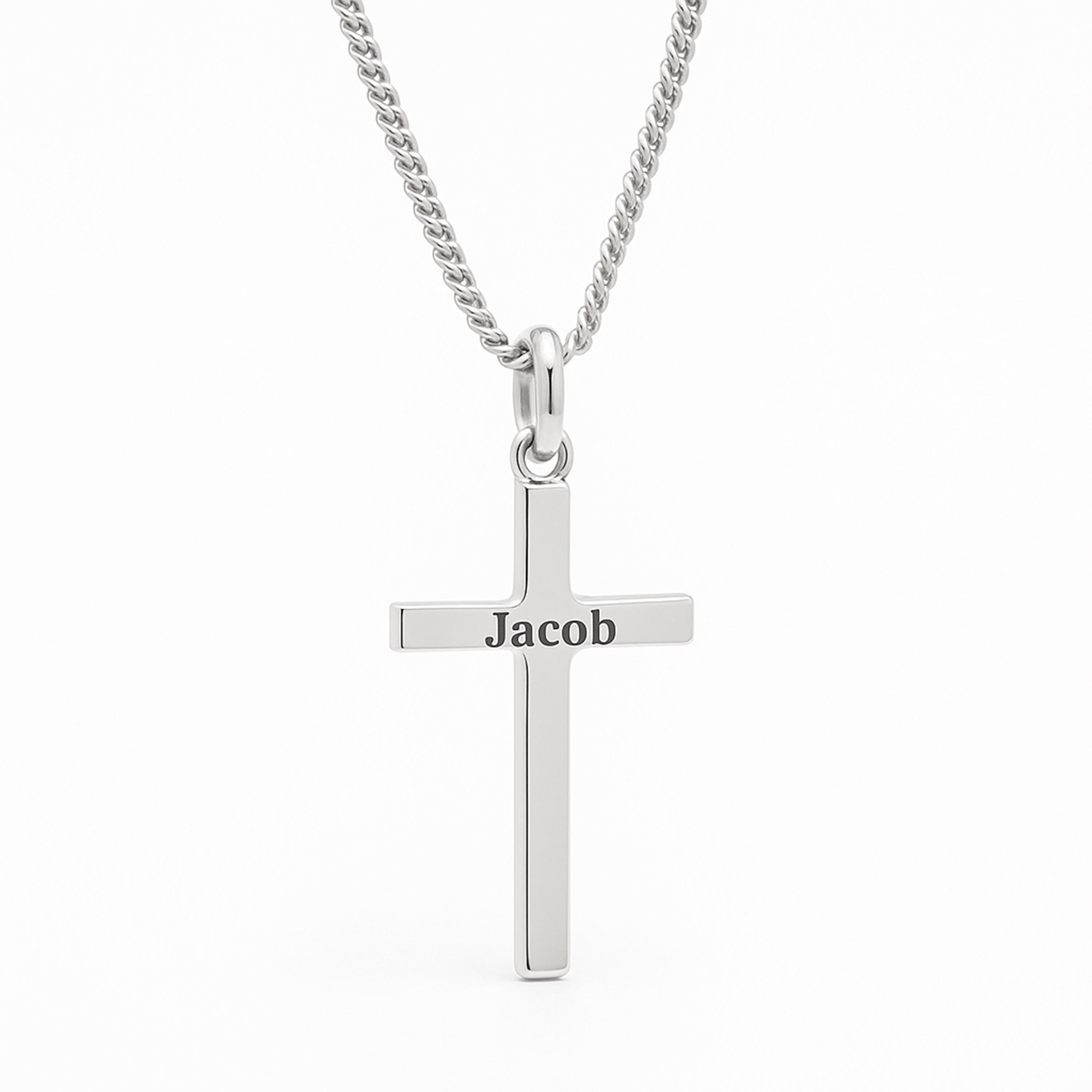 A polished sterling silver cross pendant – engraved with a name, date or message for a truly personal keepsake of faith, love and meaning.