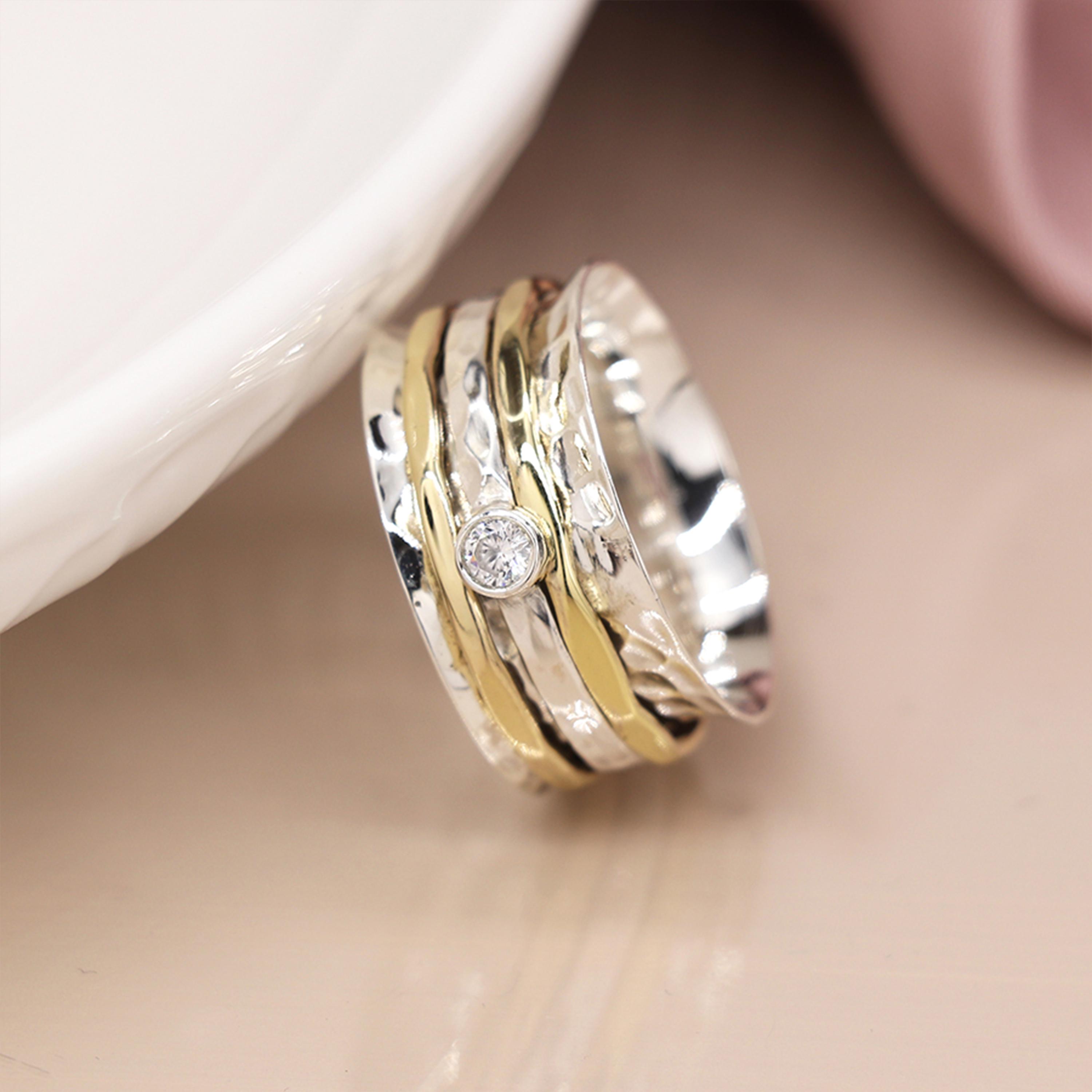 This handcrafted sterling silver swivel ring features a faceted 4mm cubic zirconia set into a moving silver central band, framed by two slim golden brass spinner bands, creating a beautifully layered ring designed for everyday wear.