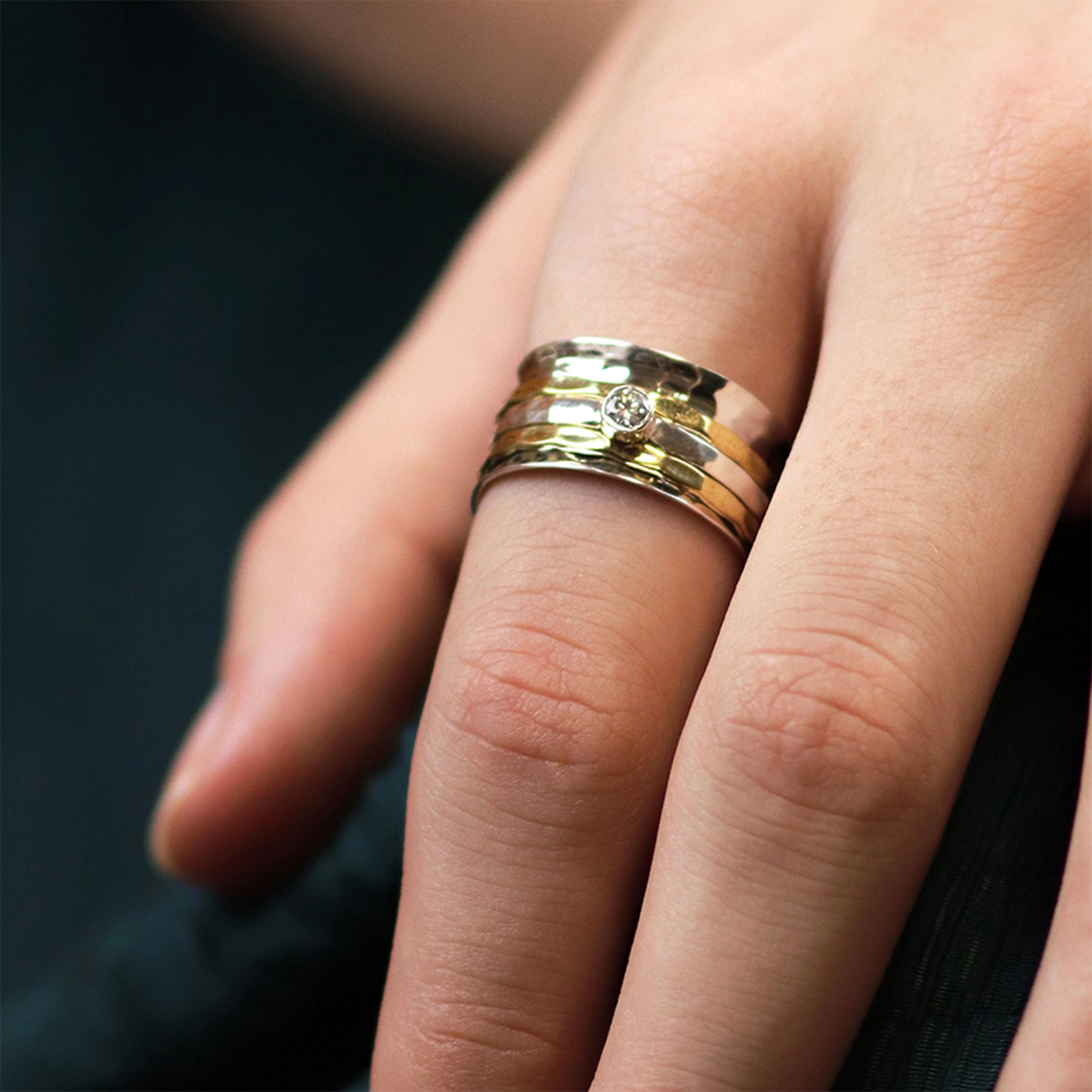 The combination of mixed metals, gentle texture, and movement makes this ring both visually striking and calming to wear. It works perfectly as a mindfulness ring, a statement everyday piece, or a meaningful gift.