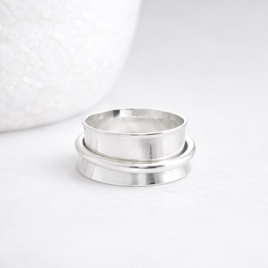 Made entirely from solid 925 sterling silver, the wider main band is shaped and gently hammered by hand, creating an organic texture that reflects the light beautifully. A slim, smooth silver spinning band is added and fitted to rotate freely, offering a subtle tactile element that many people find calming and grounding. Each ring is individually made, meaning no two are ever exactly the same.
