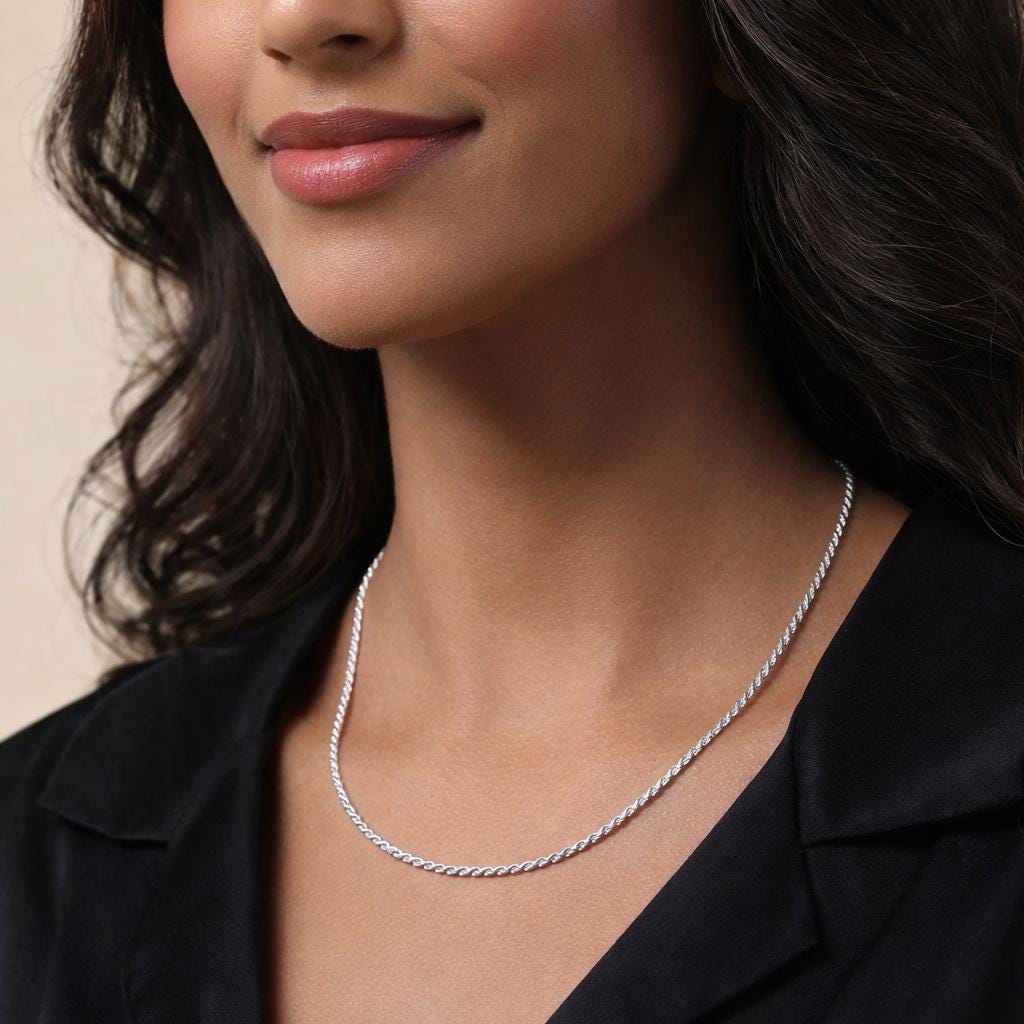 This sterling silver rope chain necklace is crafted from solid 925 sterling silver and finished with a bright, polished shine that highlights the chain’s elegant twisted design.