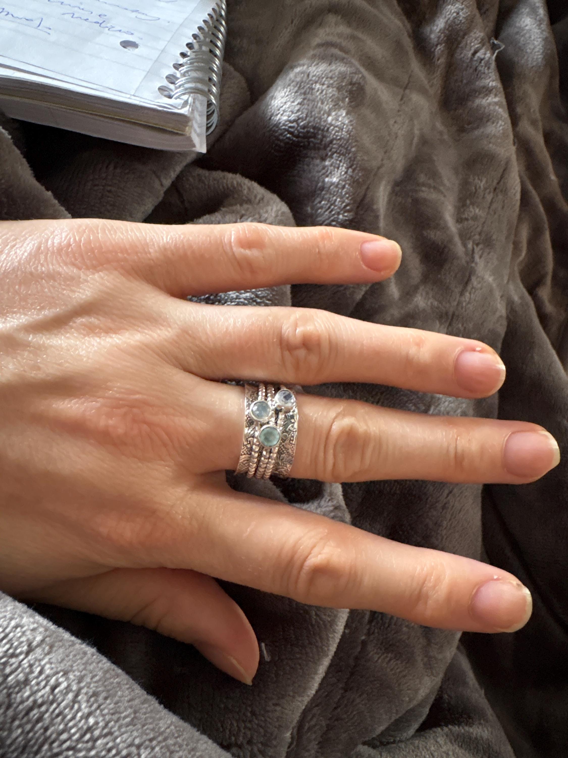 This handcrafted sterling silver spinning ring is a wearable work of art — grounding, calming, and full of natural beauty. It features a richly textured 12mm floral-stamped base band, with three delicately beaded spinning rings, each adorned with a genuine 4mm gemstone: shimmering moonstone, mystical labradorite, and serene aqua chalcedony.