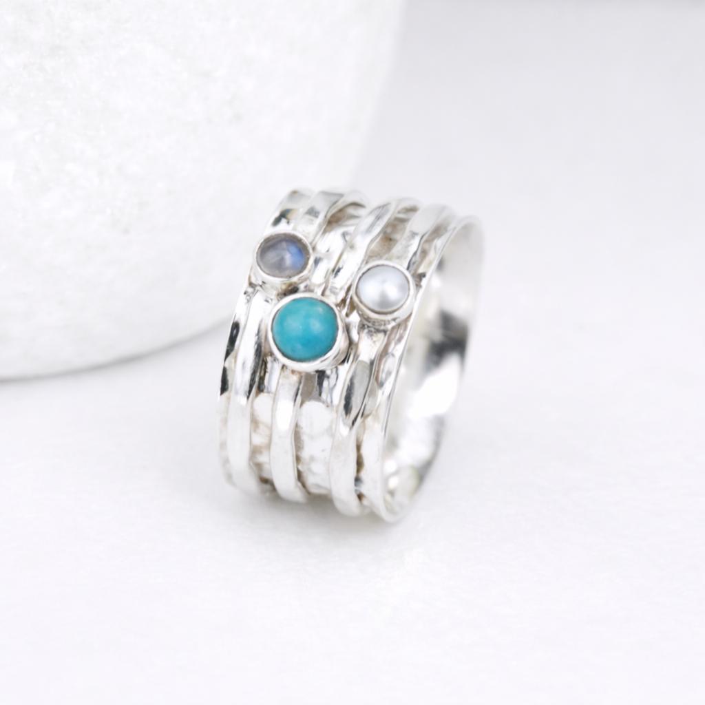 Made by hand from solid 925 sterling silver, this statement ring is designed with a textured 10mm main band that gives the piece depth and character. Three slim spinner bands rotate smoothly around the ring, each holding a carefully set gemstone. Rainbow moonstone offers a soft, luminous glow, turquoise brings a vibrant pop of blue, and pearl adds a classic, gentle sheen. The movement of the bands creates a calming, tactile feel that makes this ring as soothing as it is beautiful.