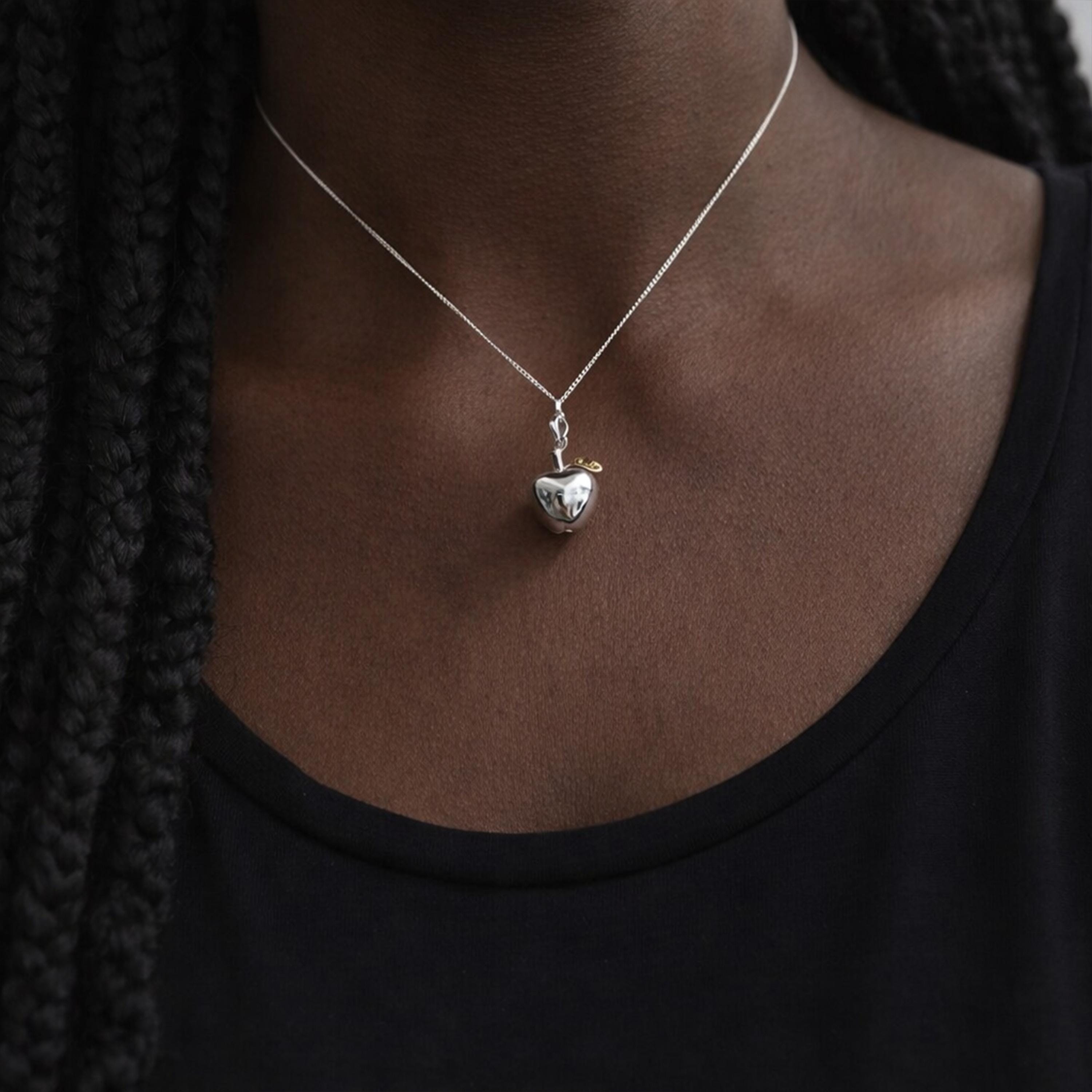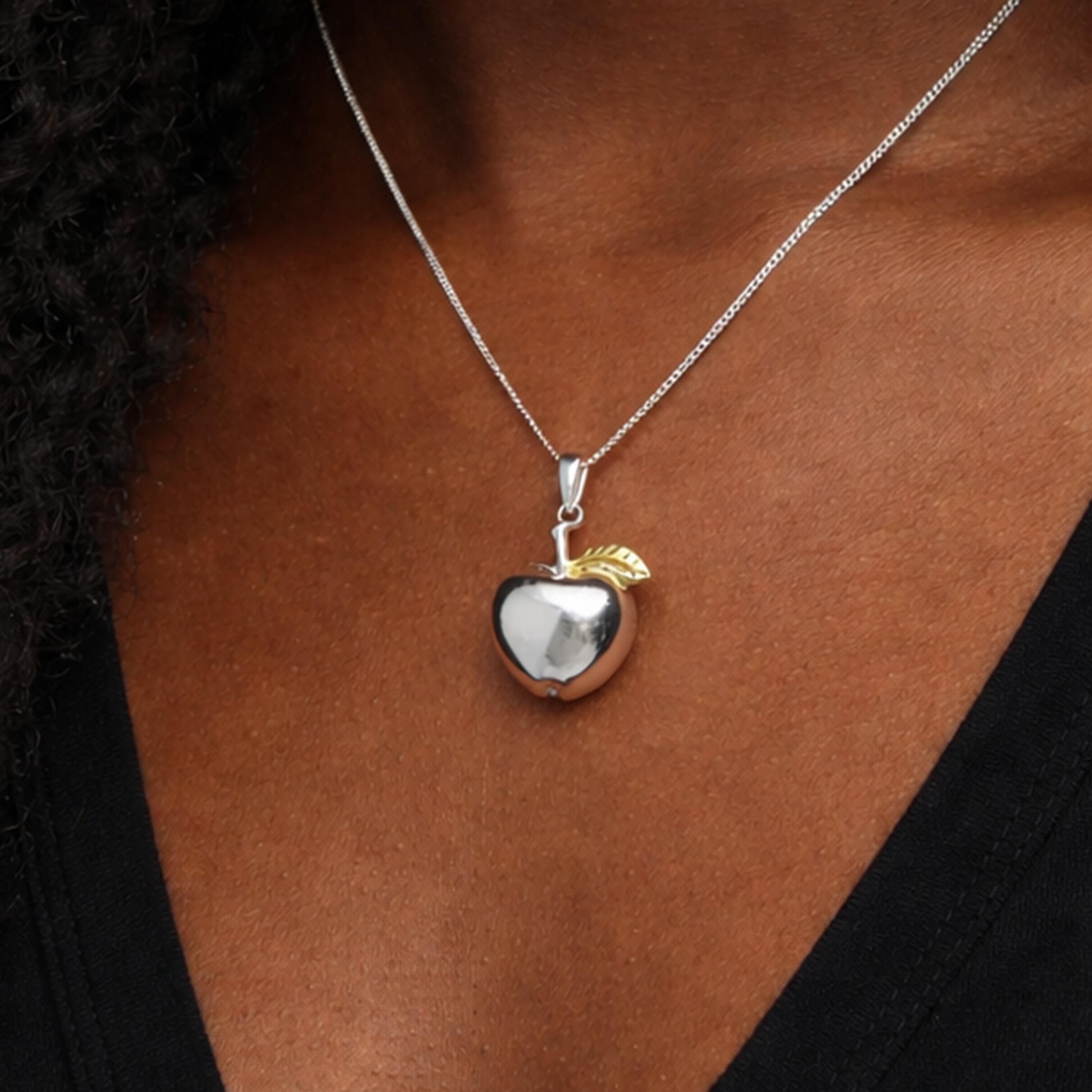 This apple pendant necklace is crafted from solid 925 sterling silver with 18ct yellow gold plated detailing and finished in a bright, polished silver tone. Featuring a smooth silver apple with a contrasting gold leaf accent, it creates a meaningful design with timeless appeal.