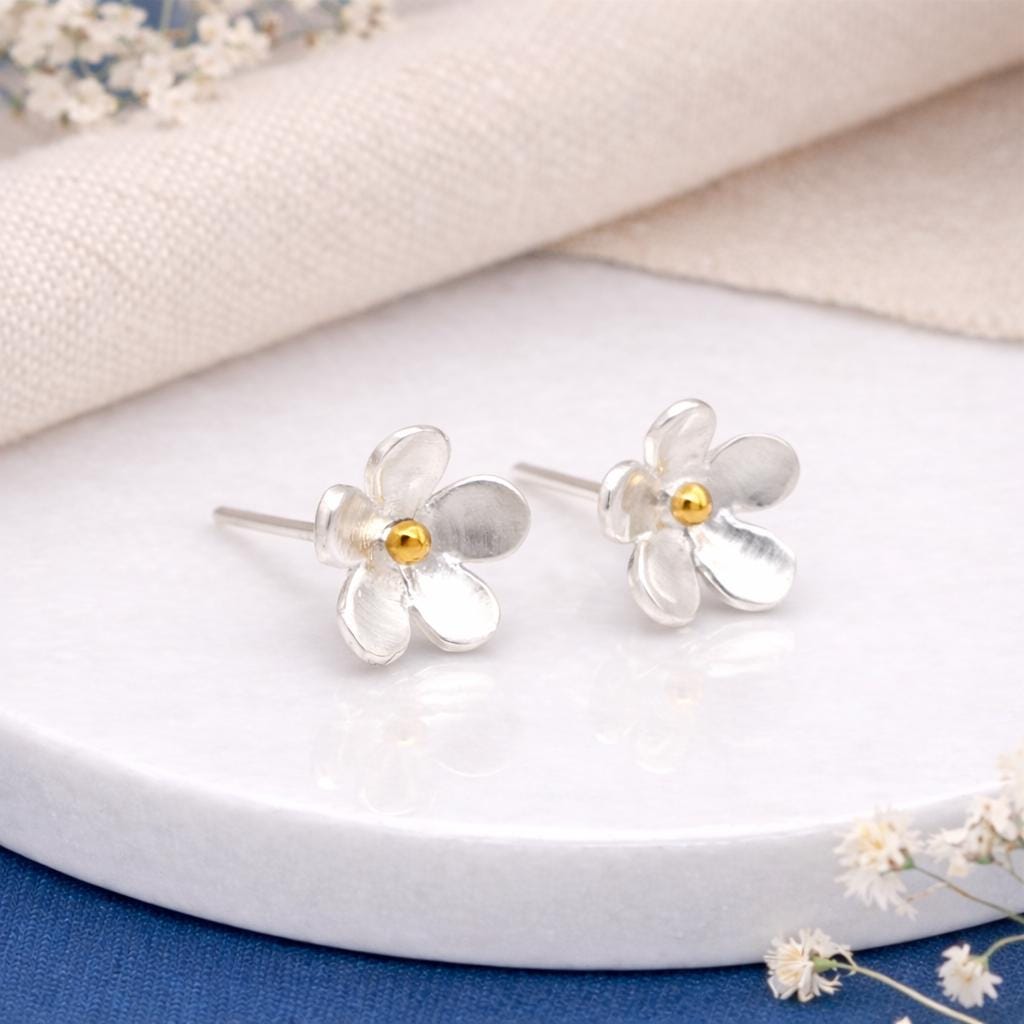 These forget-me-not stud earrings are crafted from solid 925 sterling silver with a touch of 18ct yellow gold, capturing the quiet beauty and meaning of this classic flower in a timeless, wearable design. Nickel free and hypoallergenic, they are gentle on sensitive ears and comfortable all day long.