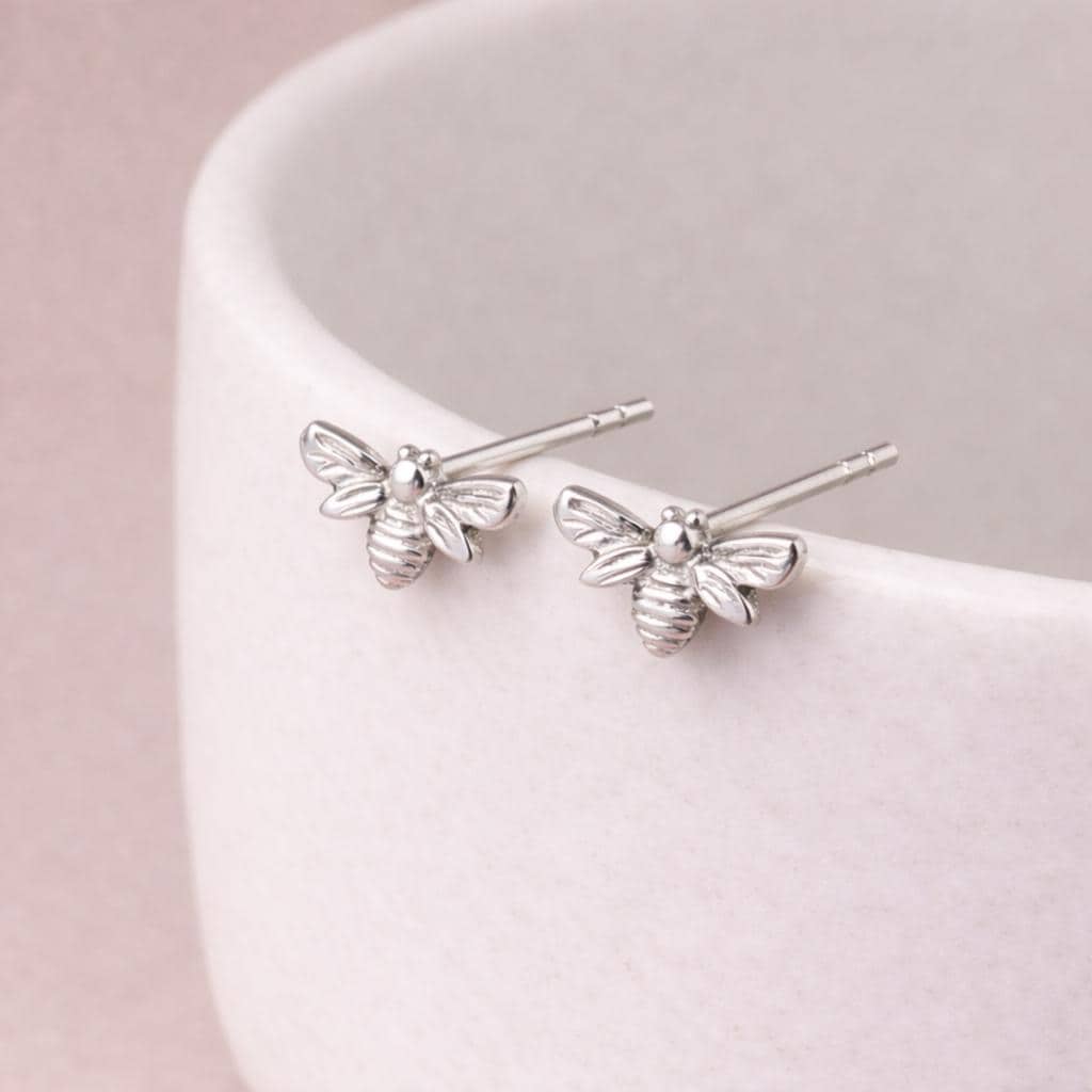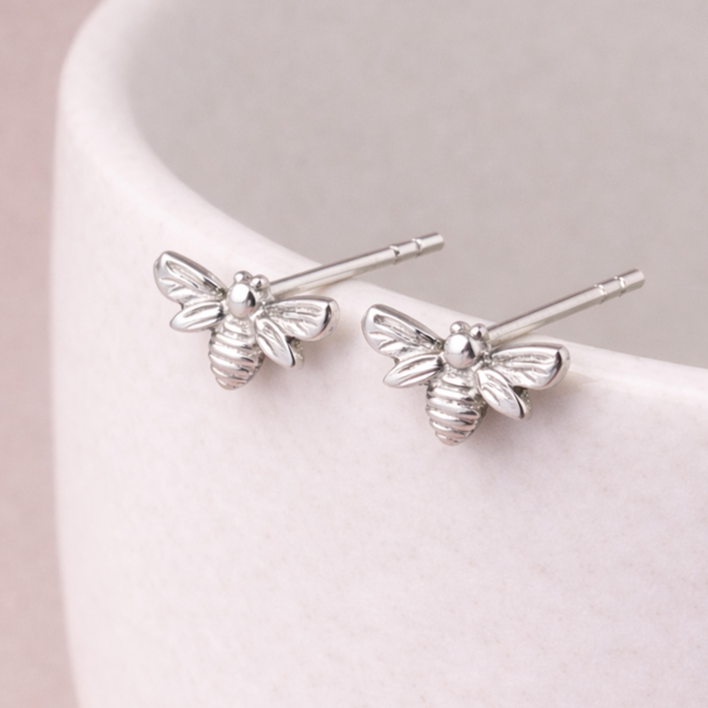 These sterling silver bee stud earrings are handcrafted from solid 925 sterling silver in a bright silver finish, featuring a beautifully detailed bee design with softly sculpted wings and body.
