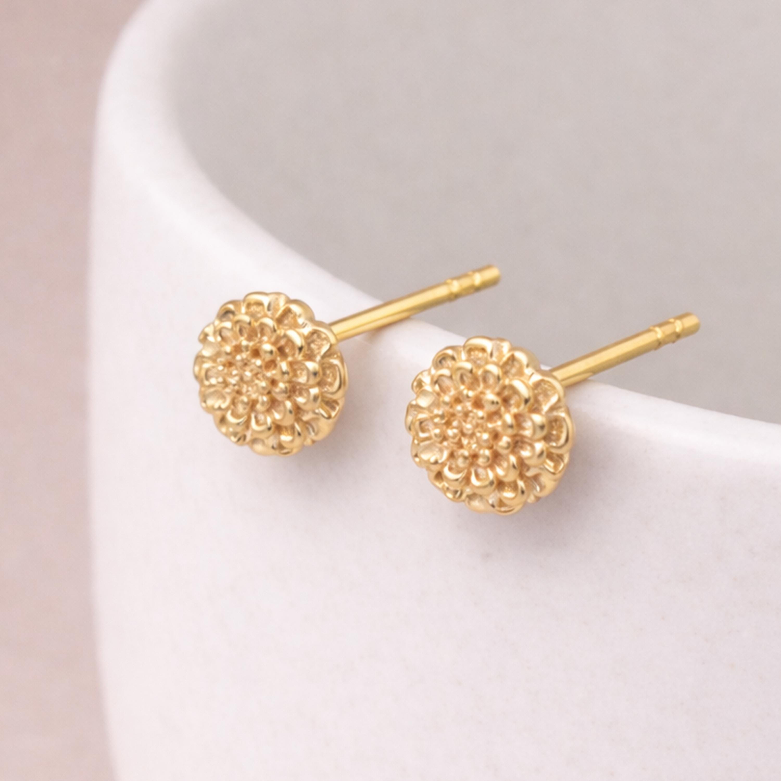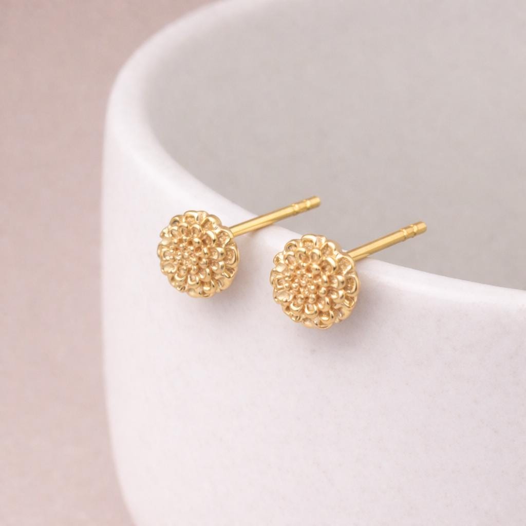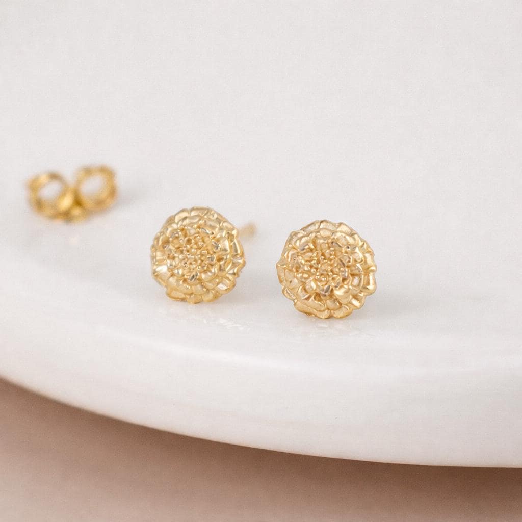 These marigold flower stud earrings are handcrafted from solid 925 sterling silver with 18ct yellow gold plating, featuring a beautifully detailed marigold design with layered, sculpted petals.
