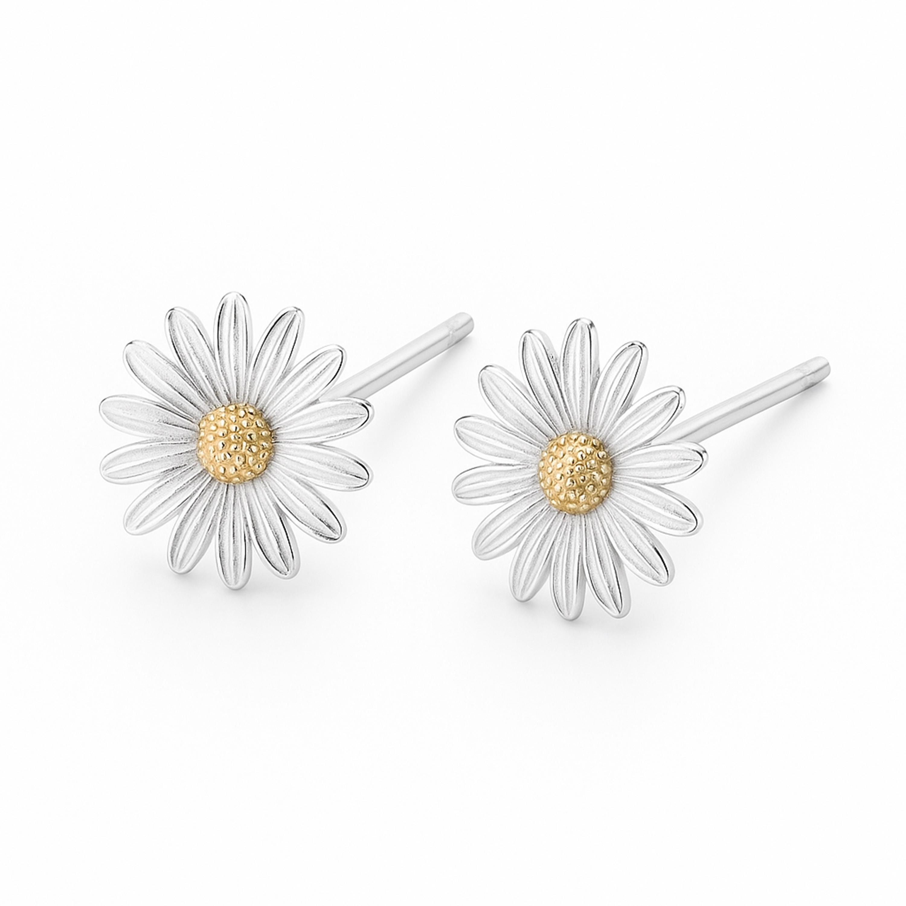 Sterling silver daisy studs with 18ct gold-plated centres — a cheerful floral design celebrating April’s birth flower.