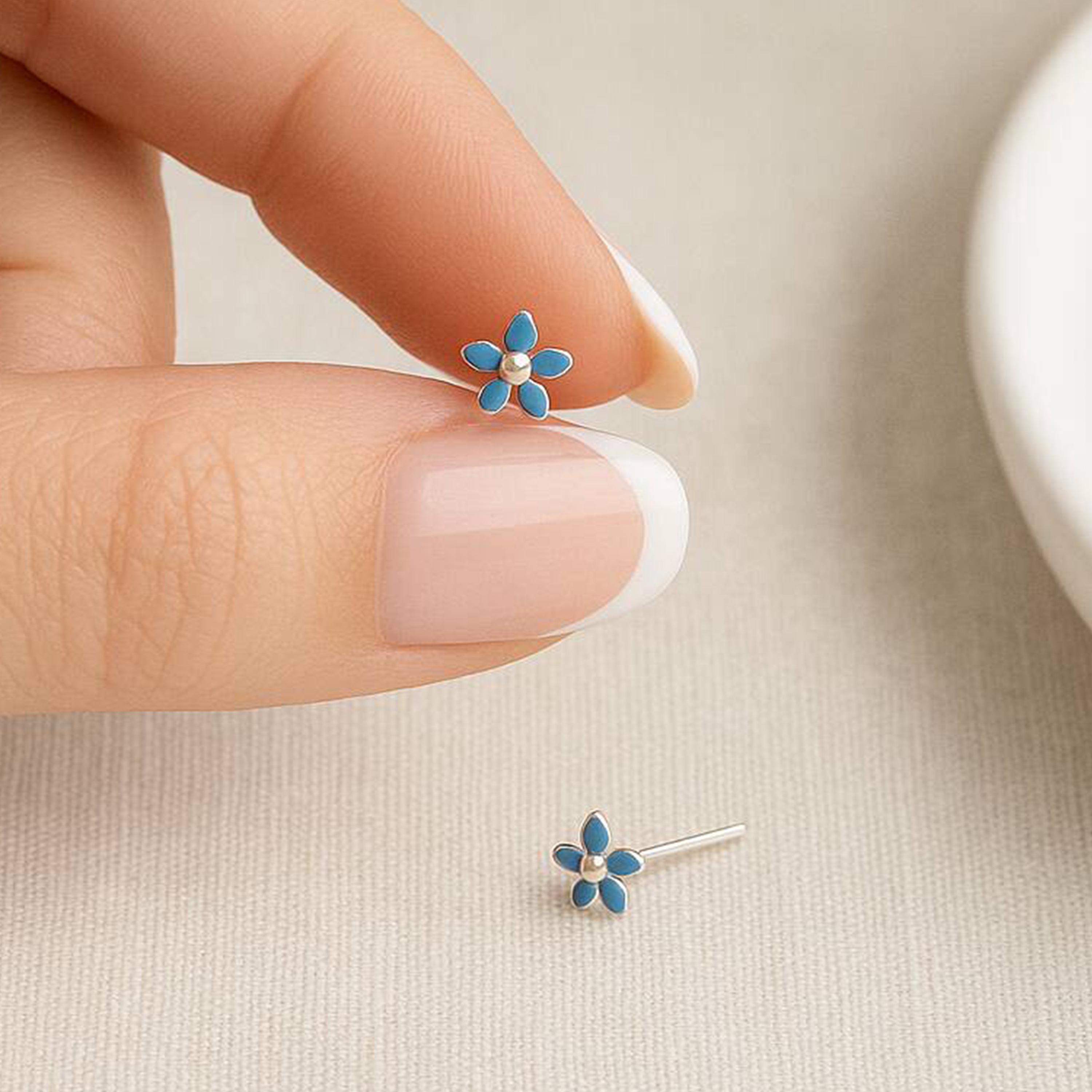 Sterling silver micro forget me not studs — dainty blue blooms perfect for stacking, second piercings, or a subtle pop of colour.
