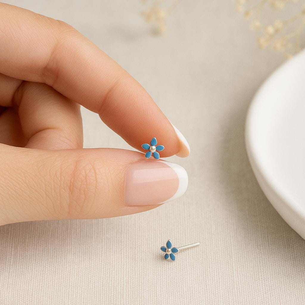 Sterling silver micro forget me not studs — dainty blue blooms perfect for stacking, second piercings, or a subtle pop of colour.