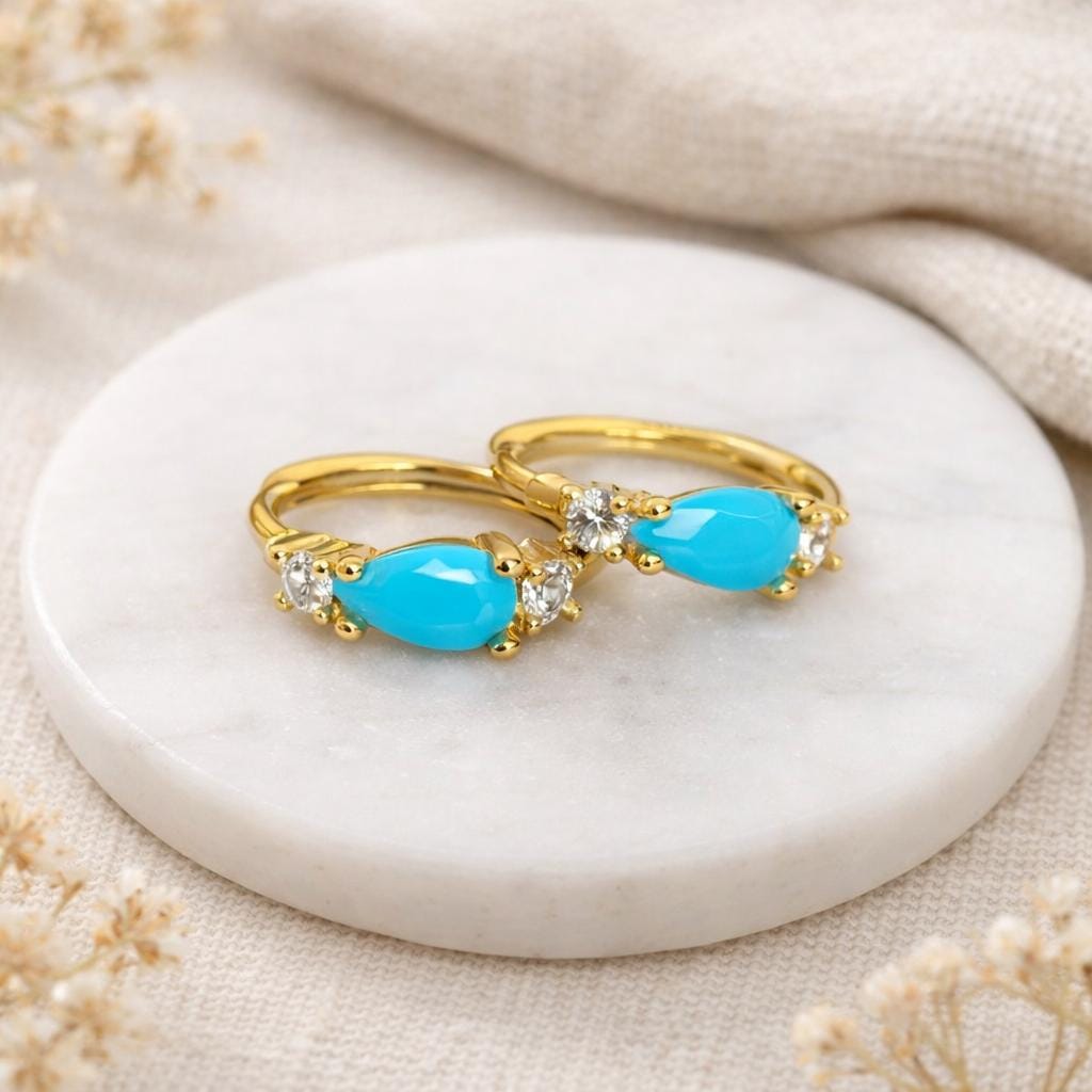 Crafted from solid 925 sterling silver and finished with rich 18ct yellow gold plating, each huggie sits neatly against the ear, with a polished turquoise teardrop at the centre and clear cubic zirconia accents adding subtle sparkle. Turquoise is the traditional December birthstone, symbolising protection, calm, and positive energy, making these earrings a thoughtful birthday or meaningful gift.