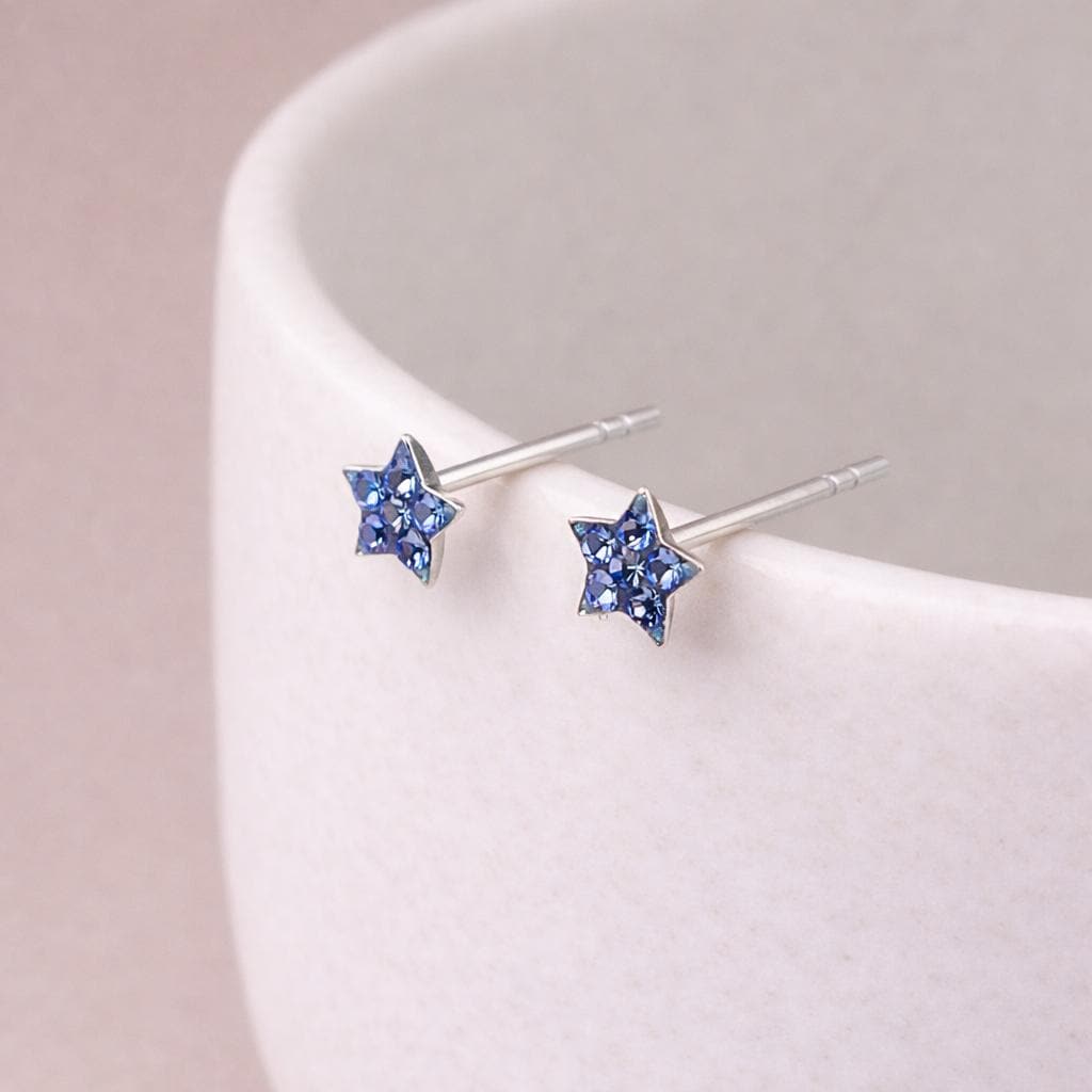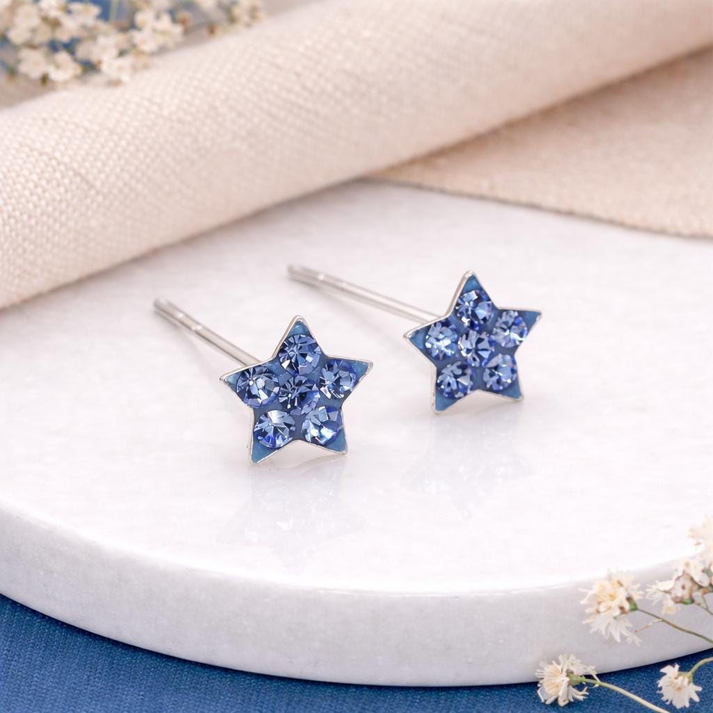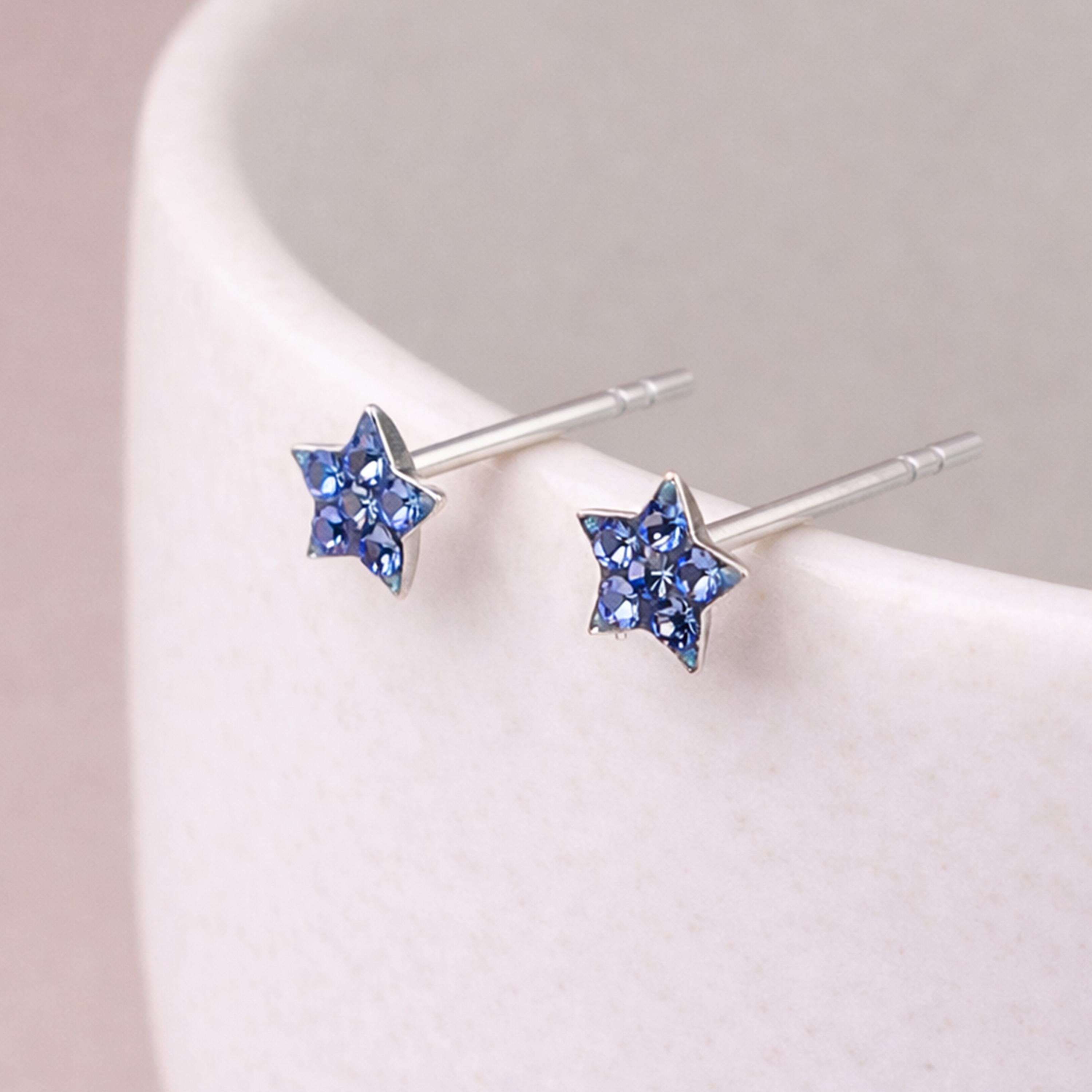 These blue crystal star stud earrings are handcrafted from solid 925 sterling silver and set with shimmering blue cubic zirconia, creating a delicate star design with rich colour and sparkle.