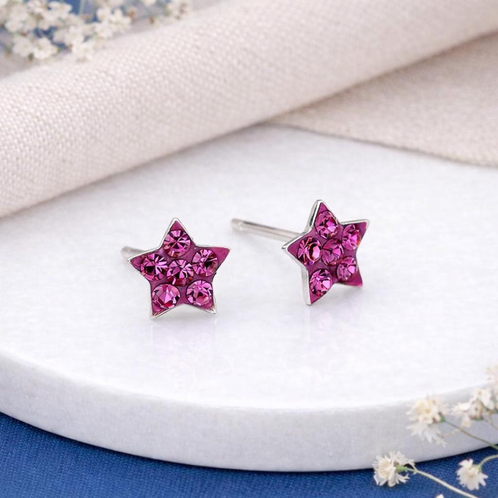 These pink star stud earrings are crafted from solid 925 sterling silver and set with sparkling pink coloured cubic zirconia gemstones, creating a fun, light-catching design that’s perfect for everyday wear. Nickel-free and hypoallergenic, they are gentle on sensitive ears and comfortable all day long.