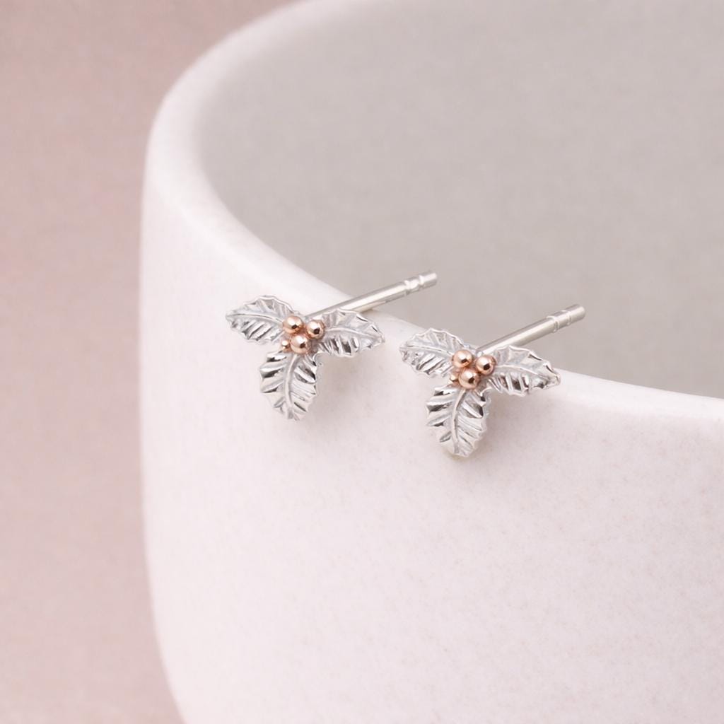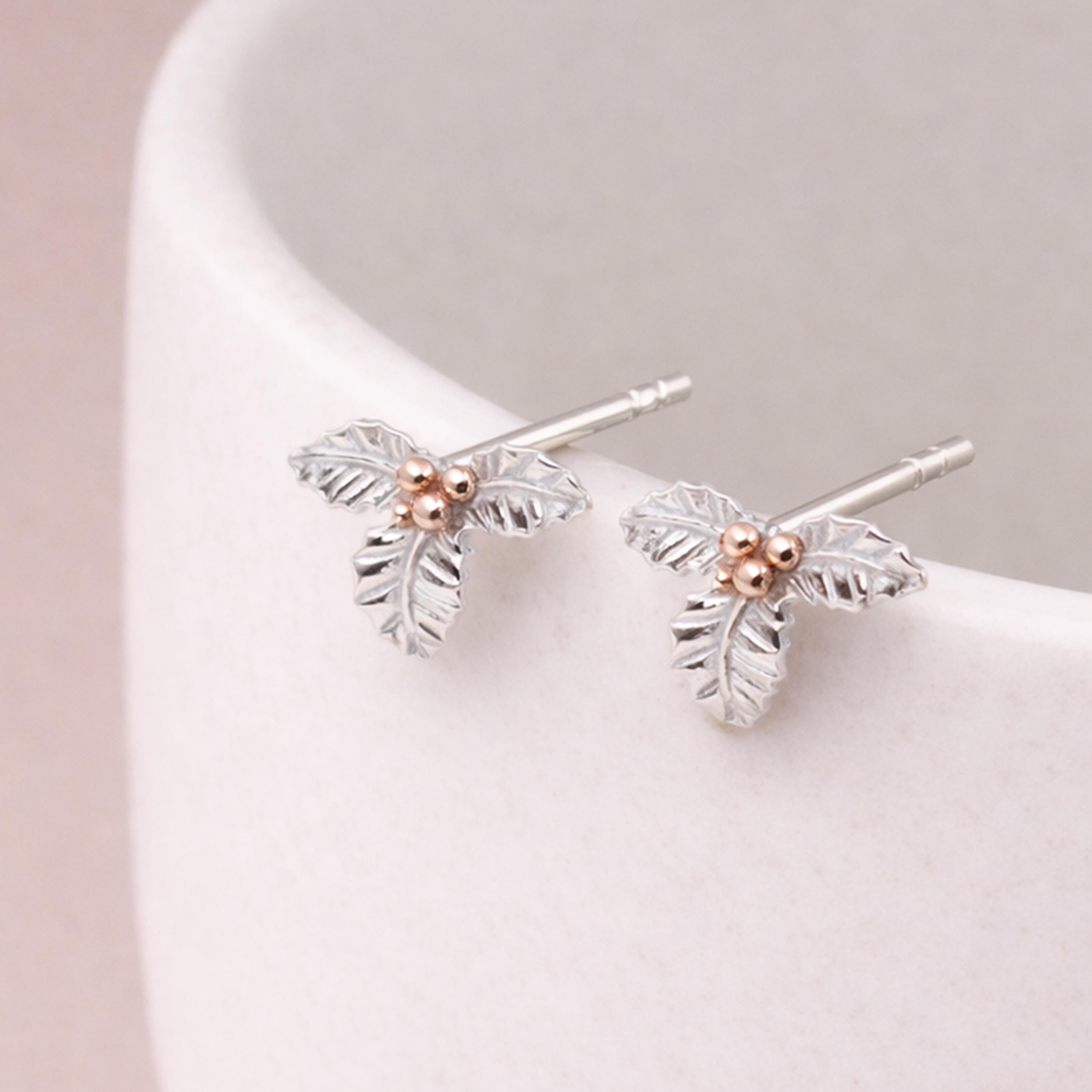 These holly leaf stud earrings are handcrafted from solid 925 sterling silver with 18ct rose gold plated berry details, featuring a finely detailed holly design inspired by this classic winter plant.