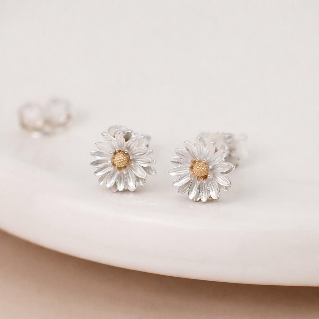These aster flower stud earrings are handcrafted from solid 925 sterling silver with an 18ct yellow gold centre, featuring a finely detailed floral design inspired by the delicate aster bloom.