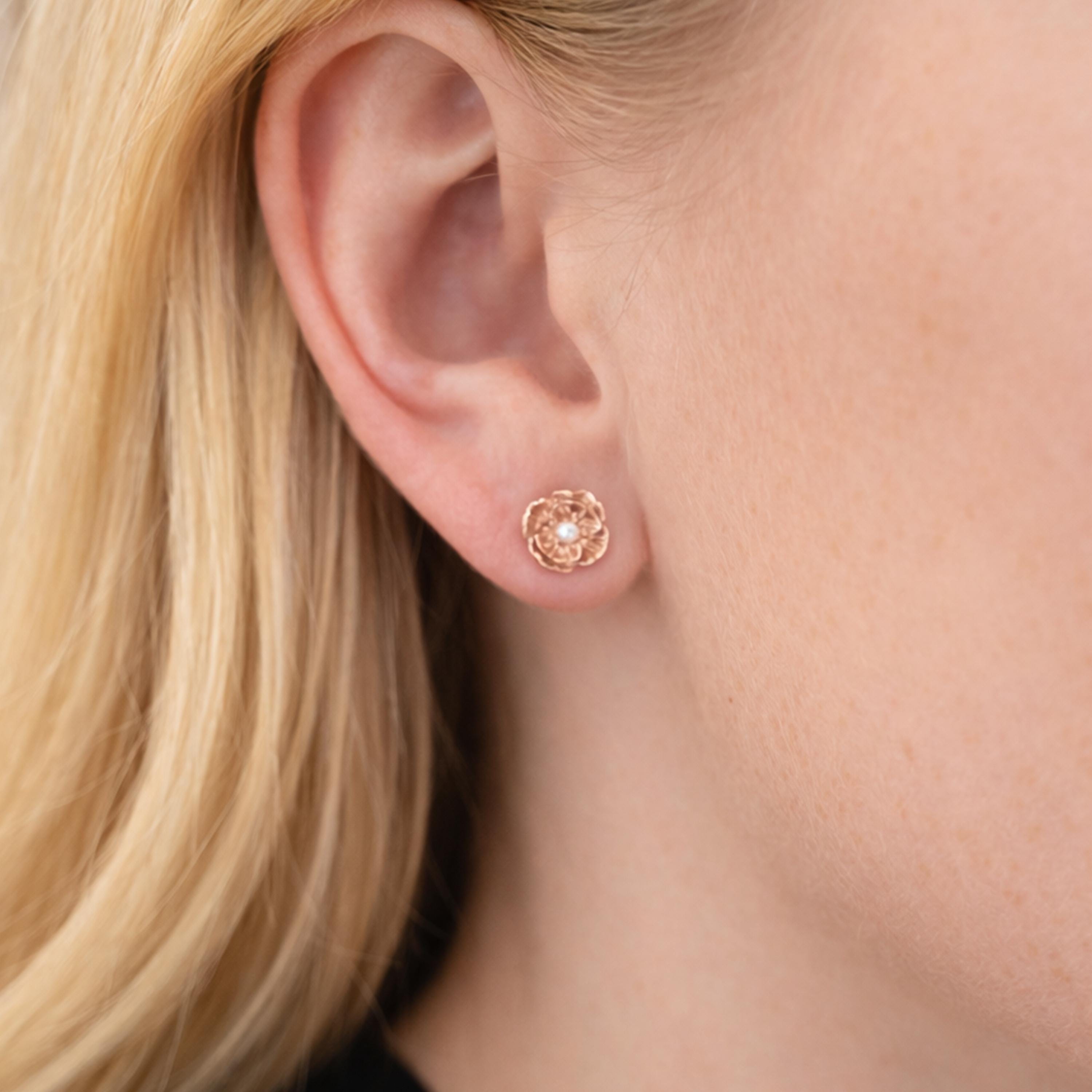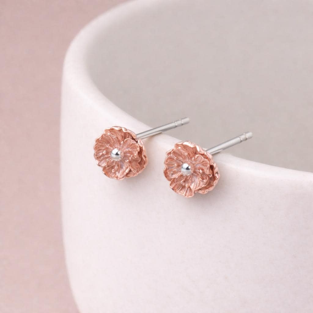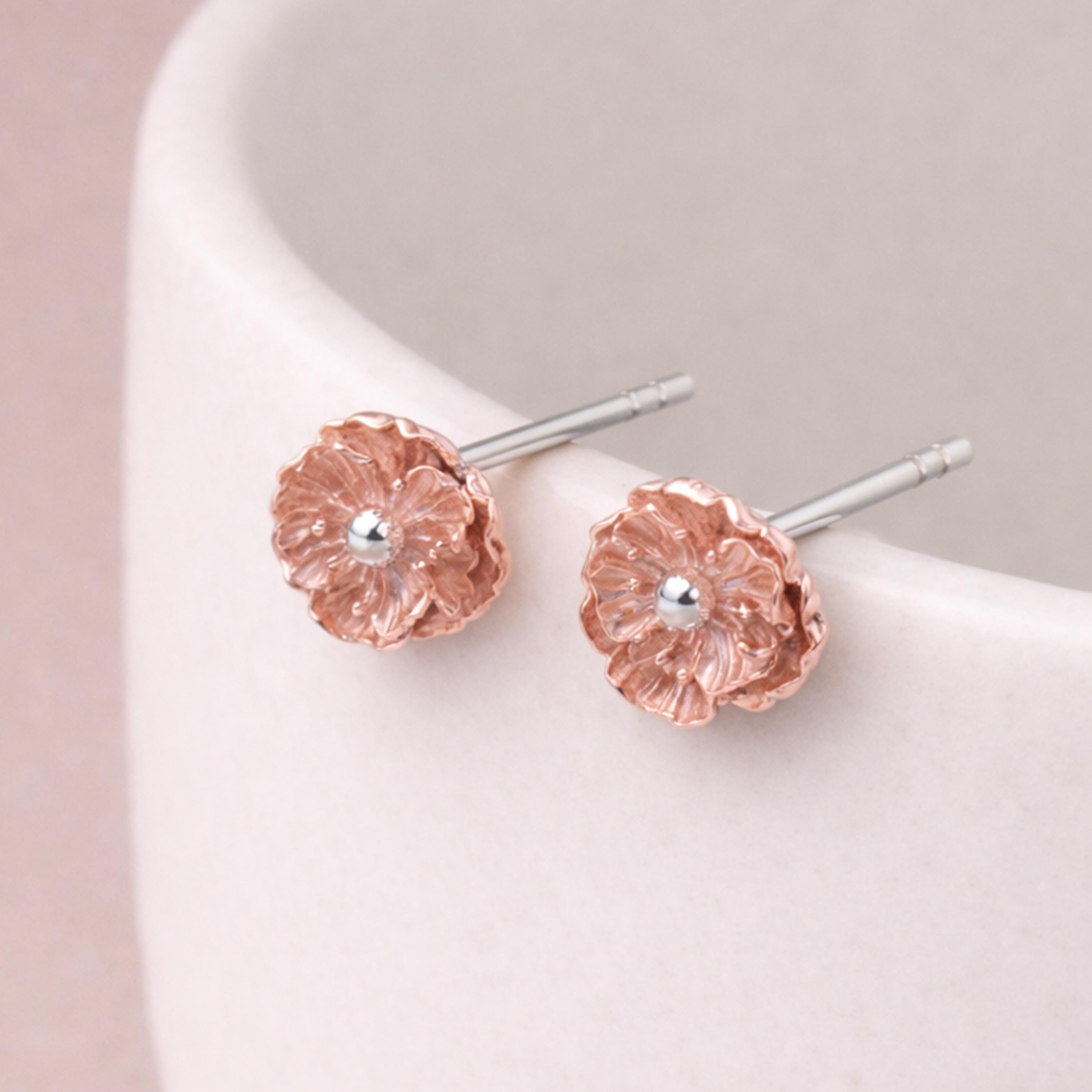 These poppy flower stud earrings are handcrafted from solid 925 sterling silver with 18ct rose gold plating, featuring a beautifully detailed poppy design with softly layered, sculpted petals.
