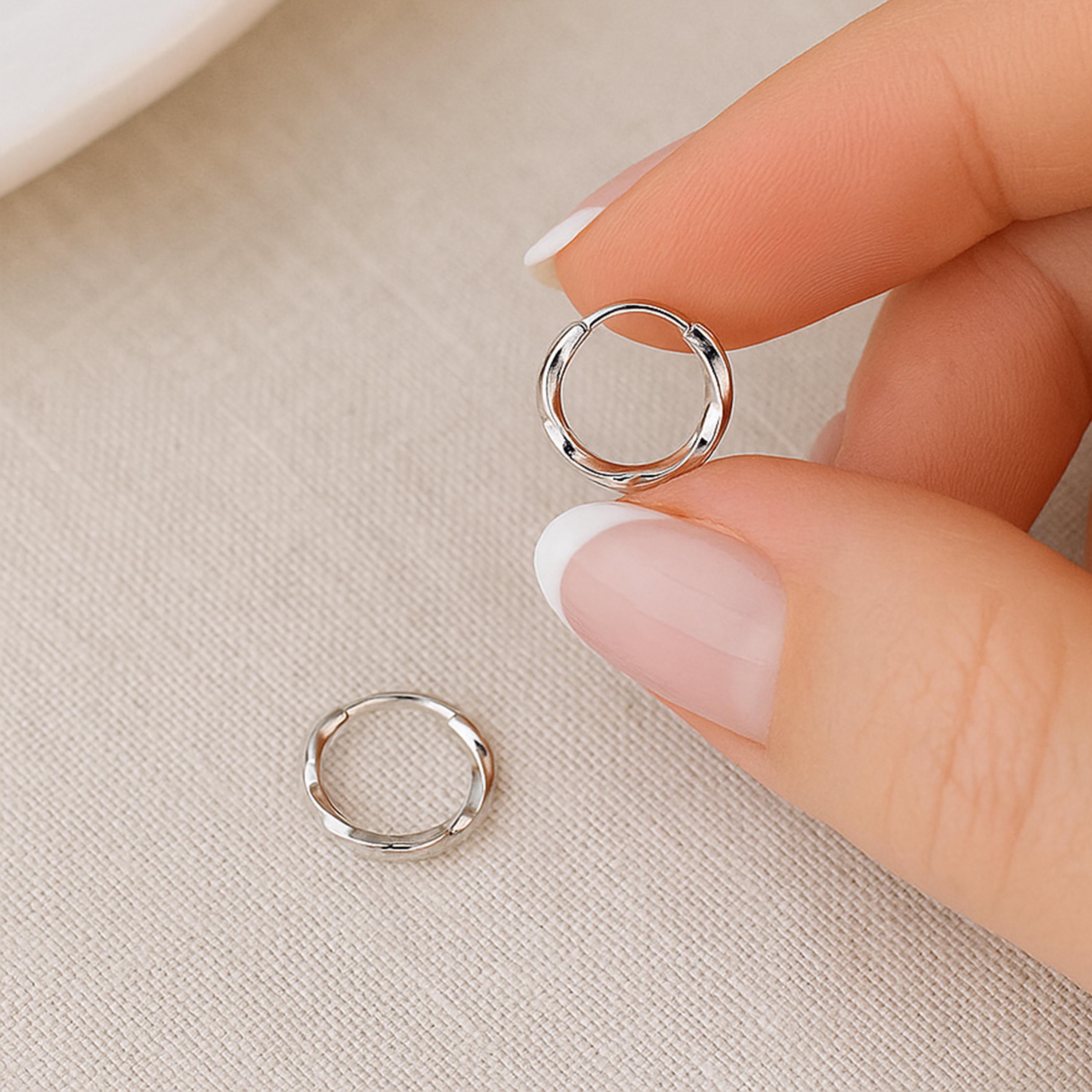 Dainty twisted silver hoops — perfect for stacking, second piercings, or children’s everyday wear.