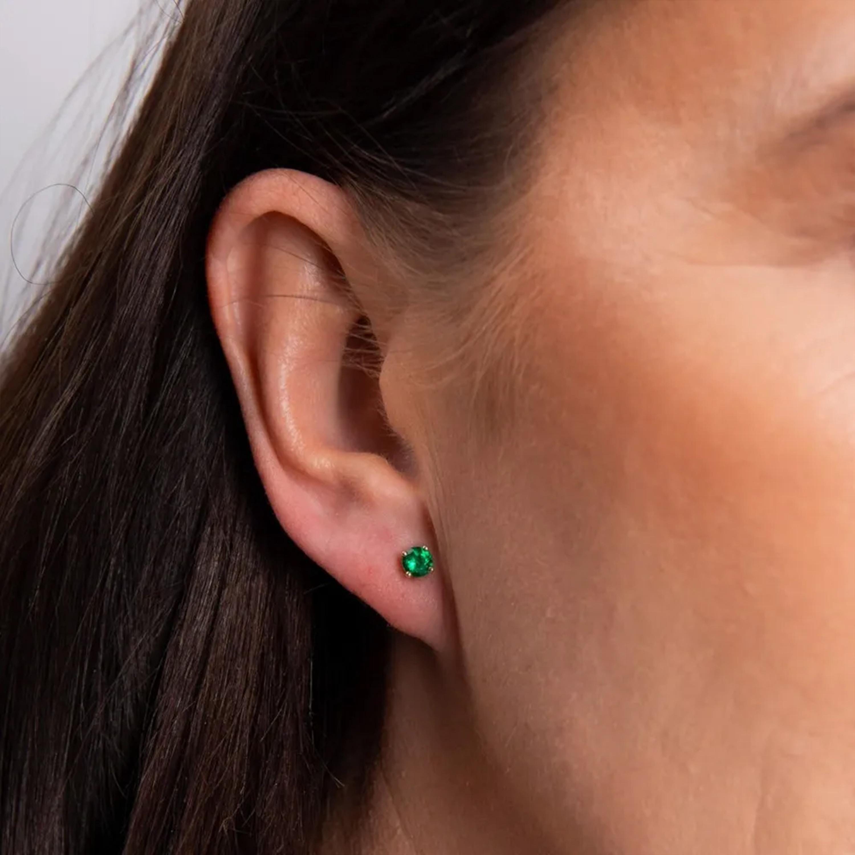 These emerald stud earrings are crafted from solid 9ct yellow gold and set with genuine emerald gemstones, creating a rich green sparkle in a warm yellow gold finish. Designed in a timeless round solitaire style, each 4.00mm stone is secured in a classic claw setting to allow light to enhance the depth and character of the gemstone.