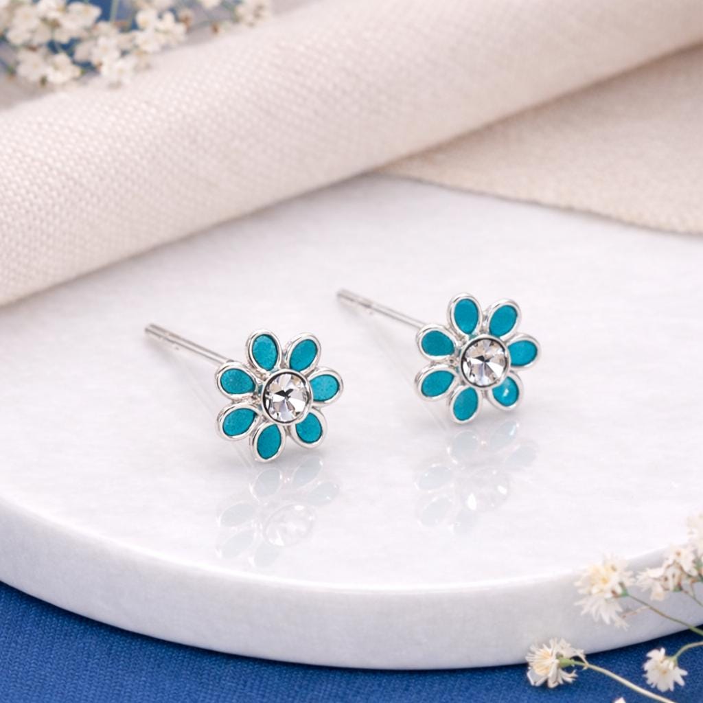 These forget-me-not stud earrings are crafted from solid 925 sterling silver and finished with rich green enamel petals and a sparkling cubic zirconia centre, creating a delicate floral design with a gentle touch of sparkle. Nickel-free and hypoallergenic, they are comfortable for everyday wear, even on sensitive ears.