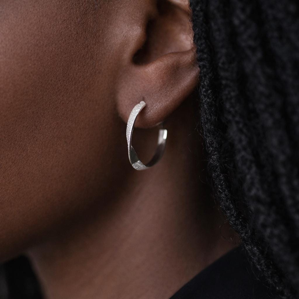 A fresh twist on a classic — these sterling silver open hoop earrings blend subtle elegance with sculptural style. The flat, curved shape features a gentle twist design, combining both brushed and polished finishes for soft contrast and everyday sparkle.