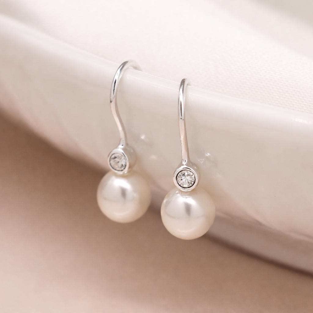 These sterling silver pearl and cubic zirconia drop earrings feature soft ivory pearls suspended from fine silver hooks, finished with a delicate clear cubic zirconia accent for a refined everyday sparkle.