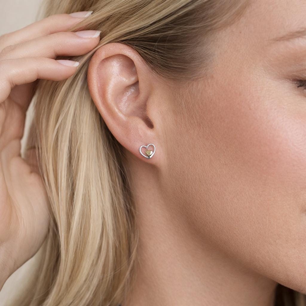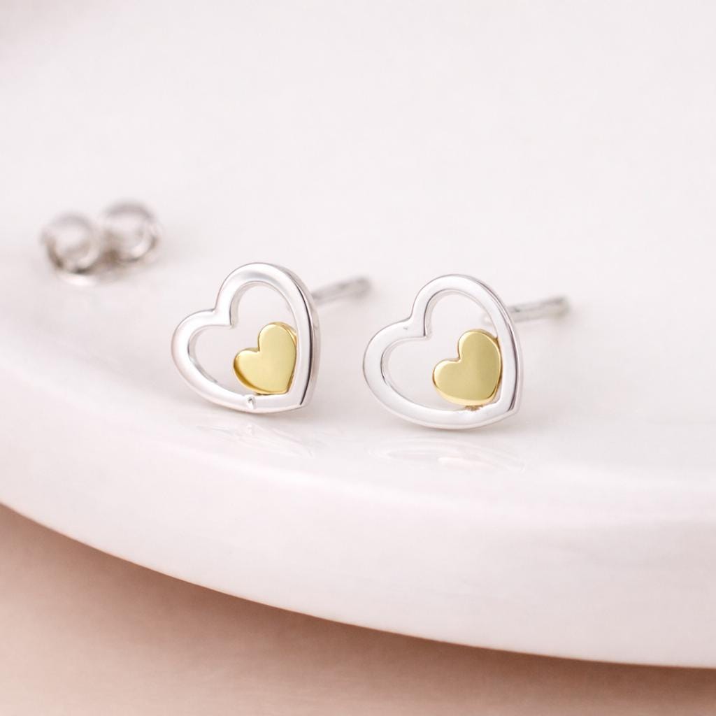 These two tone heart stud earrings are handcrafted from solid 925 sterling silver with an 18ct yellow gold heart detail, featuring a delicate open heart design with a smaller gold heart nestled inside.