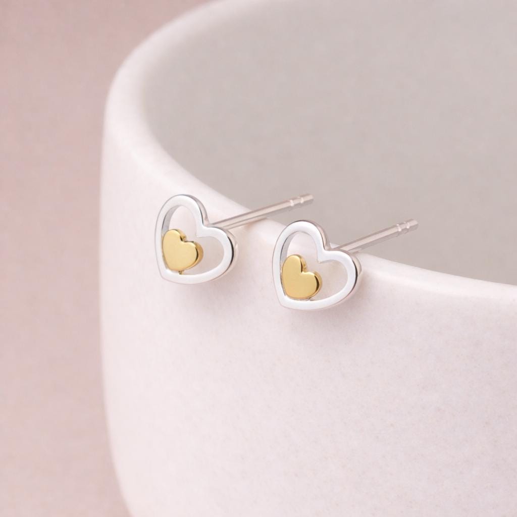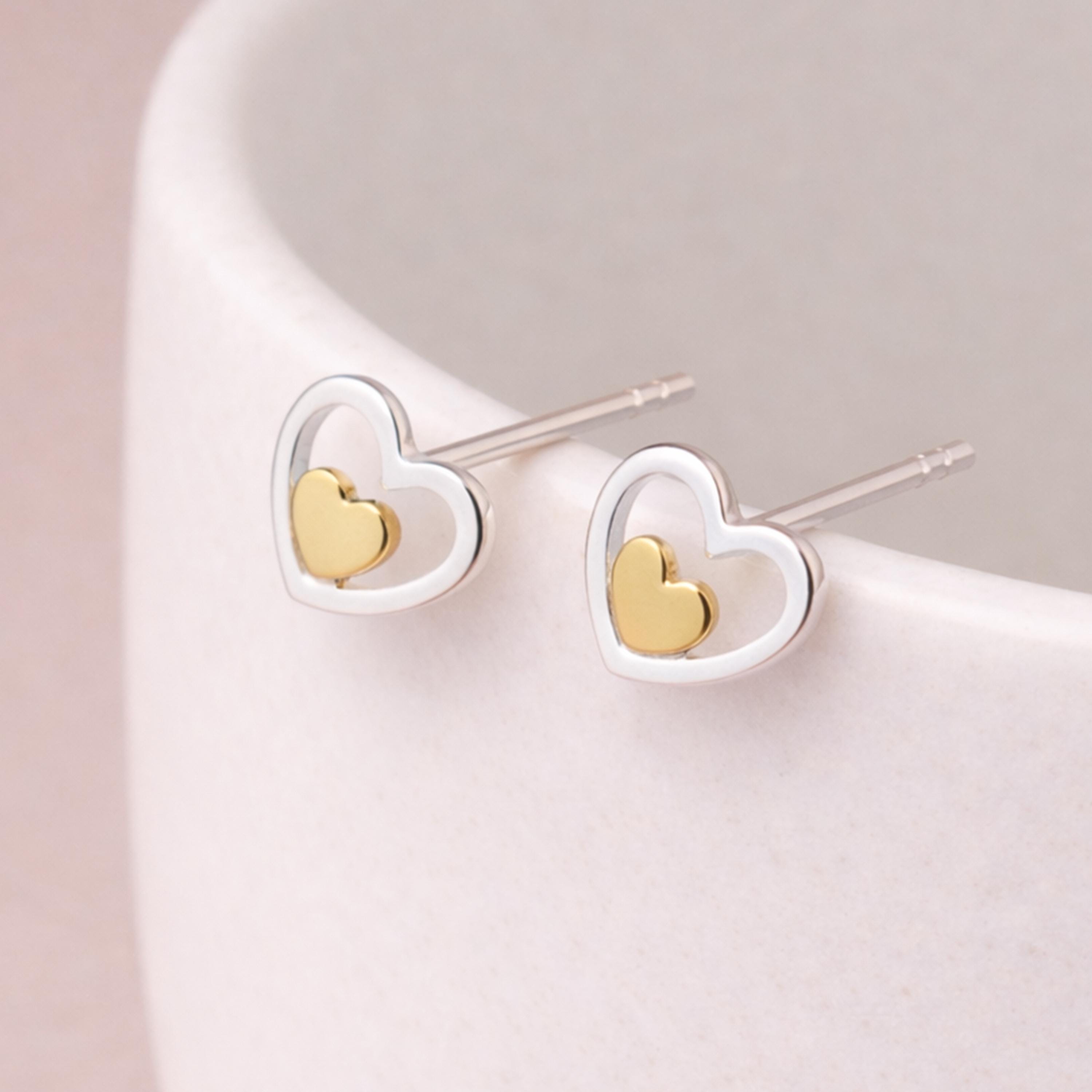 These two tone heart stud earrings are handcrafted from solid 925 sterling silver with an 18ct yellow gold heart detail, featuring a delicate open heart design with a smaller gold heart nestled inside.