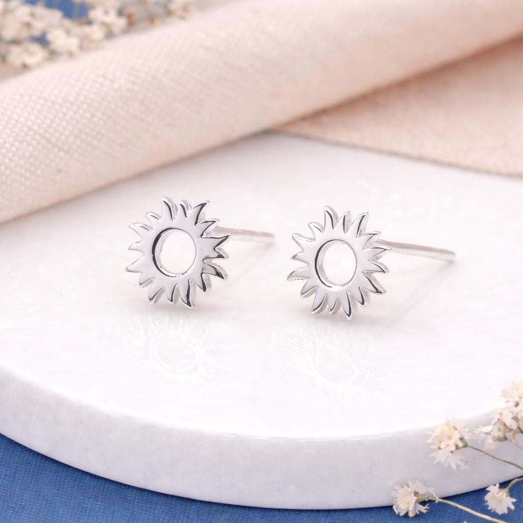 These sterling silver sun stud earrings are handcrafted from solid 925 sterling silver and finished in a bright, polished silver tone, featuring a delicate sunburst design with a smooth open centre.