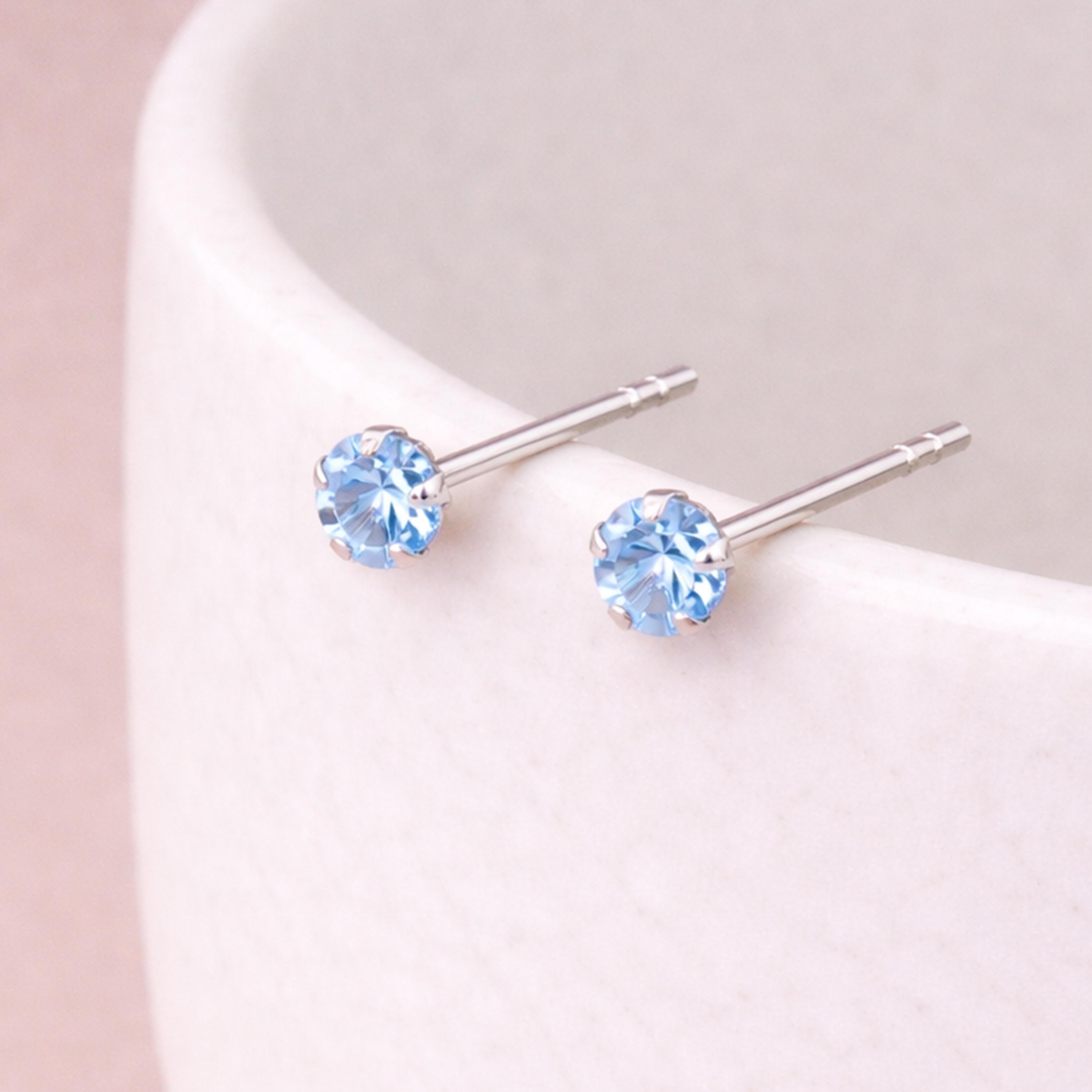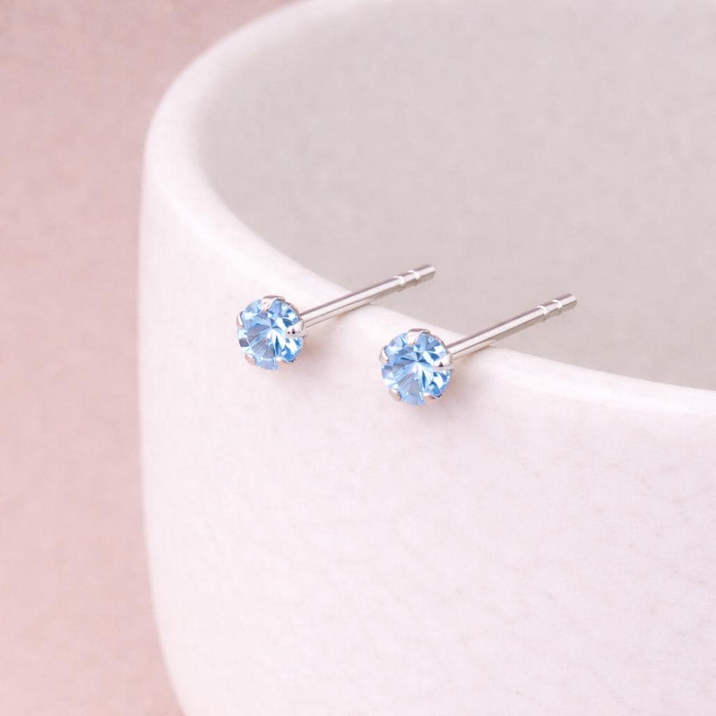 These sterling silver March birthstone stud earrings are handcrafted from solid 925 sterling silver, featuring a sparkling aquamarine coloured cubic zirconia in a simple, timeless setting.